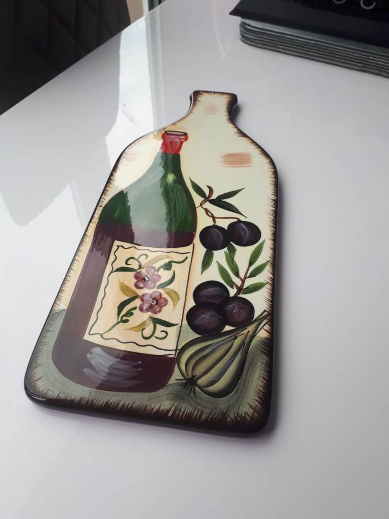 A decorative olive/wine design bottle shaped tile to use as a surface protector or a wall mount as wall mounted tile 1980s