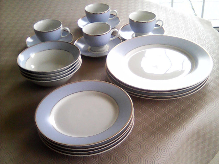 The set includes tea plates, cups, saucers, soup/cereal/dessert bowls and dinner plates.