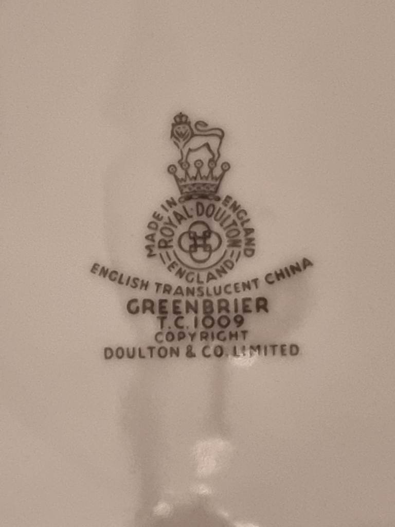 Royal Doulton dinner service for six people, tea service for six plus. Greenbrier pattern. Dinner service has serving dishes, serving plates and gravy boat. Tea service comes with sugar bowl and milk jug. Sold together. Collection only.