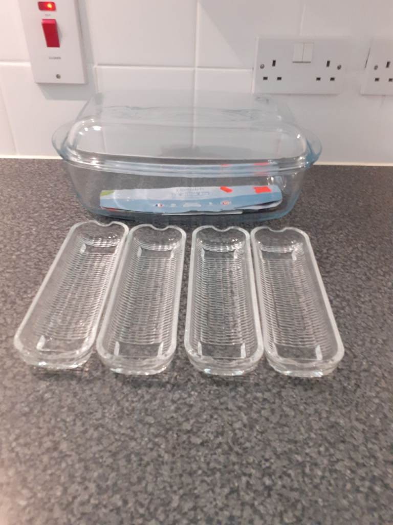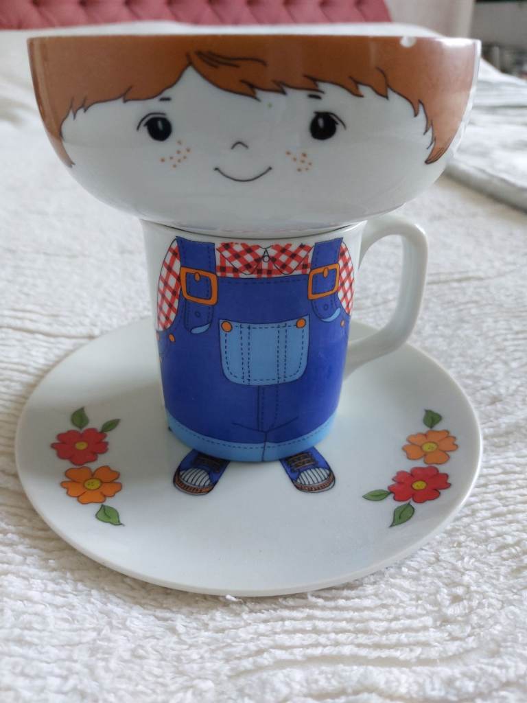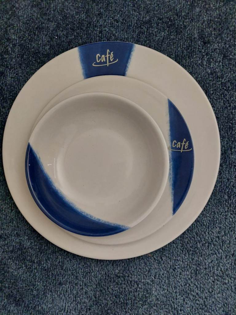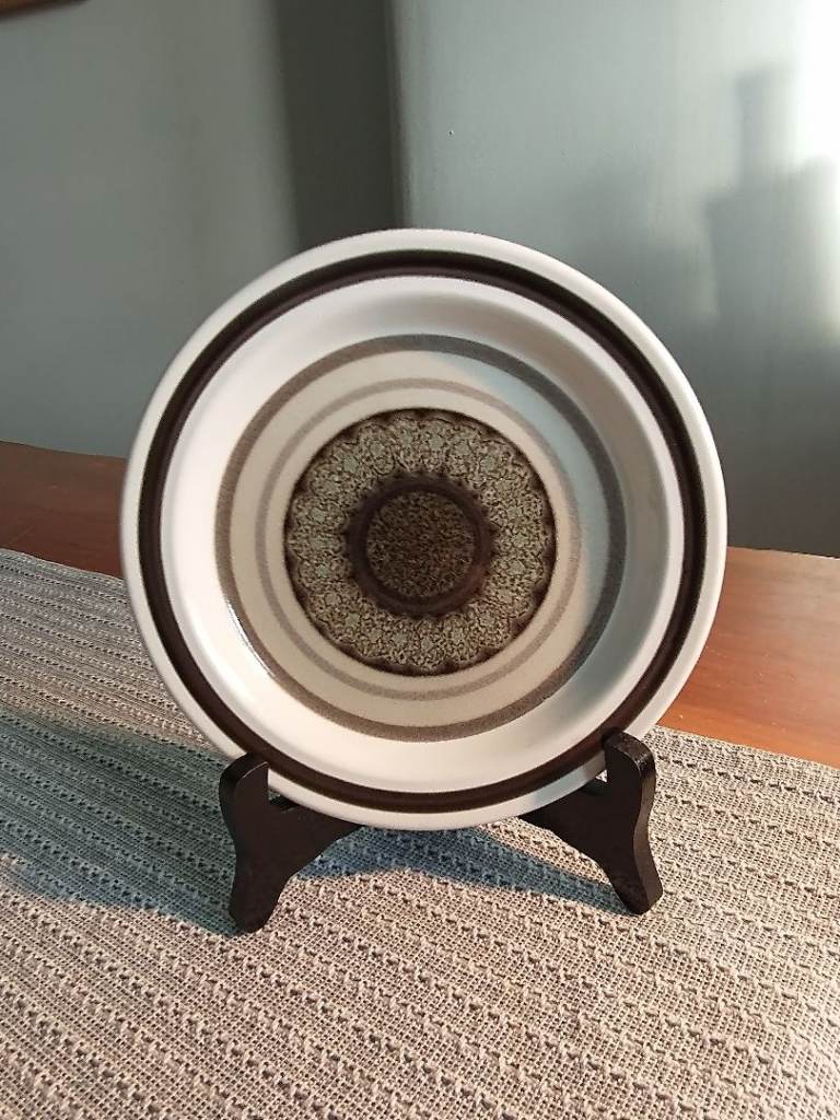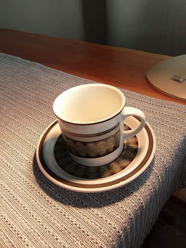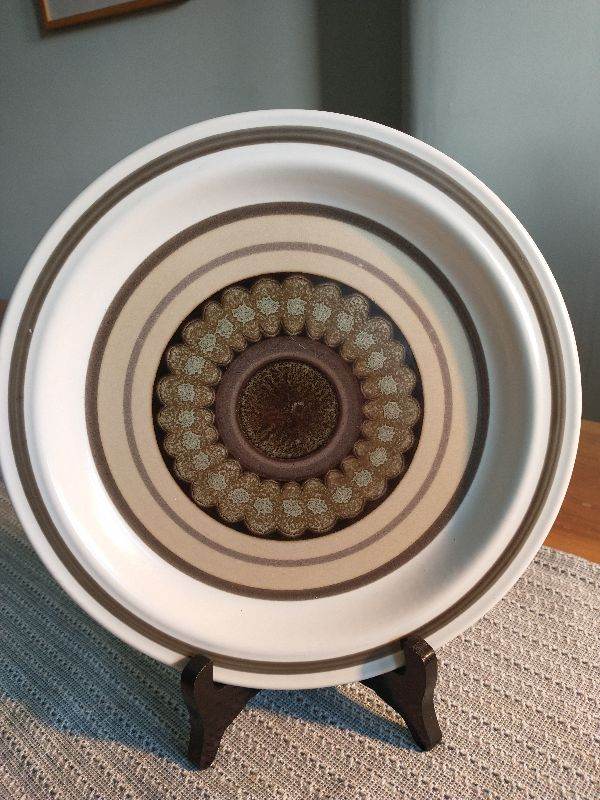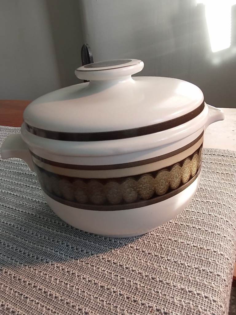 70's retro dinner set and coffee/tea set. 6 full place settings plus serving dish, casserole, gravy boat and saucer. Mint condition, no chips, cracks or crazing. Predominately white with green/brown design.