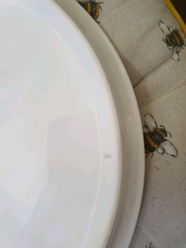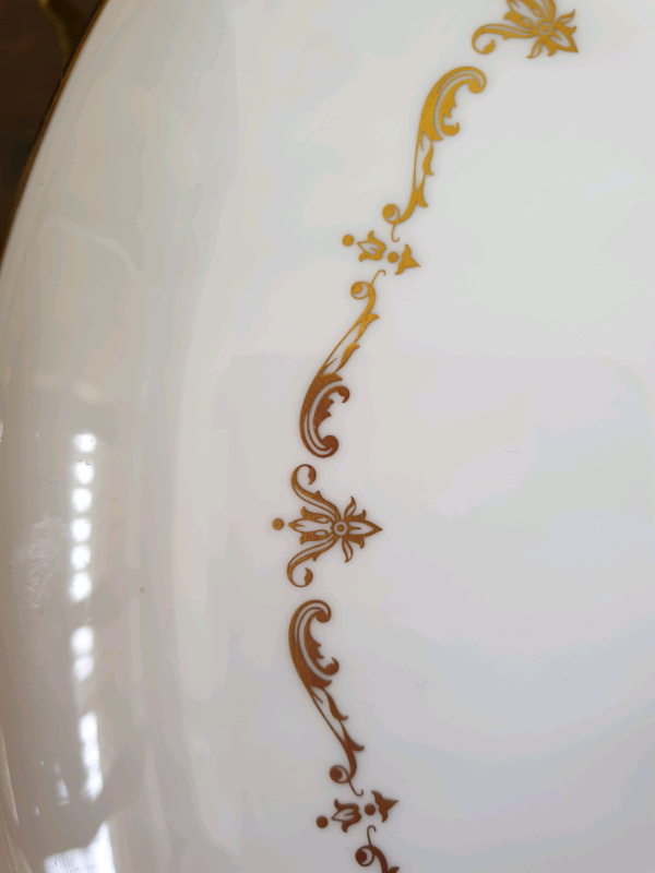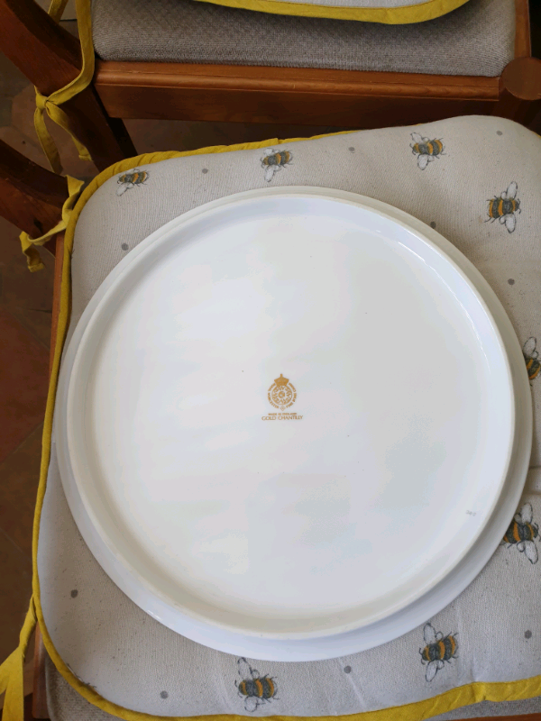 This particular example is from the 'Gold Chantilly' range - produced from 1963 to 1985. It is basically white in colour and has a classy scroll pattern in gold colour round the circumference of the plate just inside the edge. It has the stamp of authenticity along with a number to the base (see pics). It is 11"/28cm in diameter.