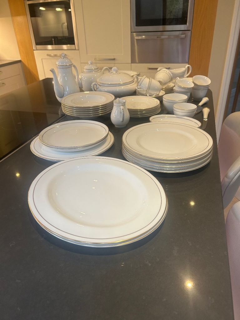 Beautiful 51 piece dinner service. Fine bone china. White with gold decoration. Excellent Condition.