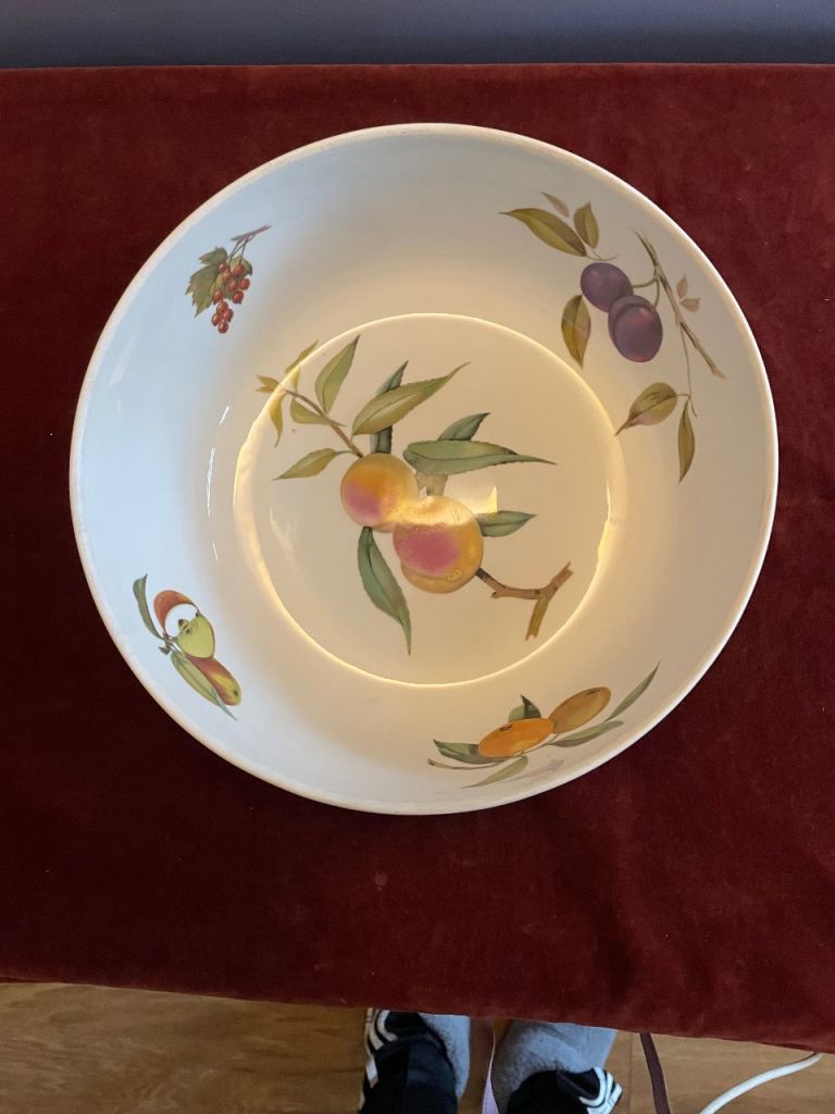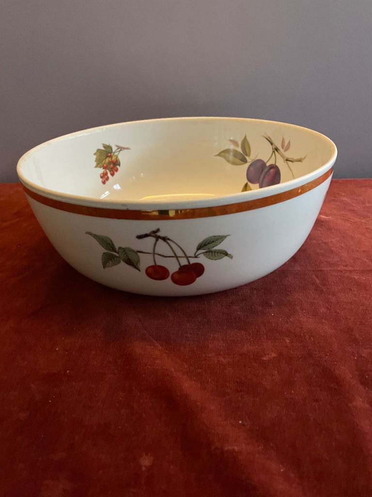 A Royal Worcester Evesham 35cm (approx. 14-inch) porcelain salad /Serving bowl is a large serving piece from the classic, fruit-themed dinnerware, featuring colourful orchard fruits (plums, pears, cherries) with distinctive gold trim, made in England