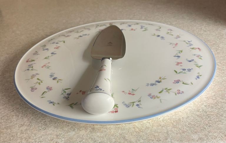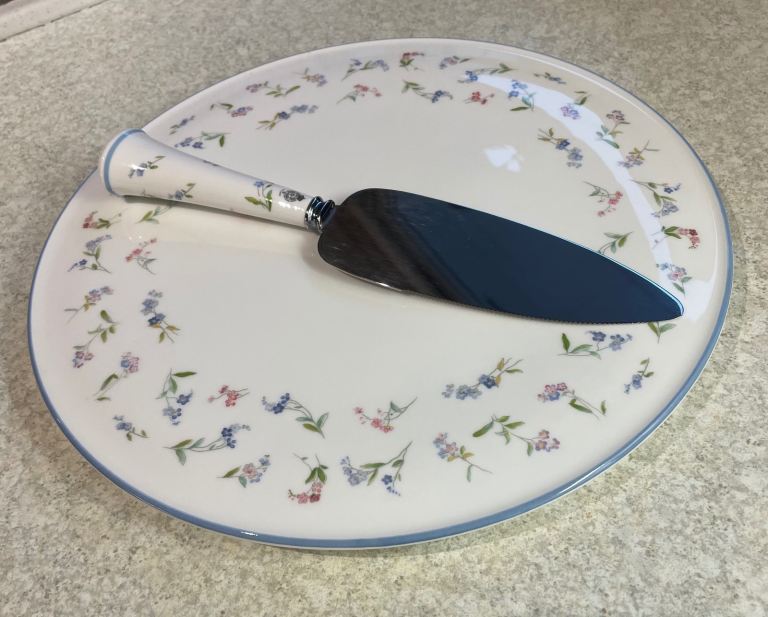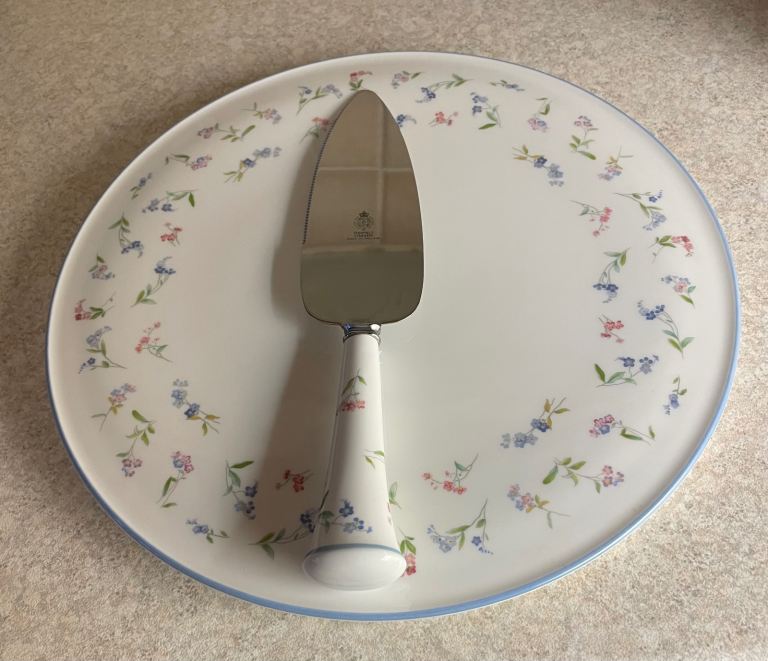 Beautiful bone china gateau/cake/pastries plate from Royal Worcester in the 'Forget Me Not' pattern with matching knife.