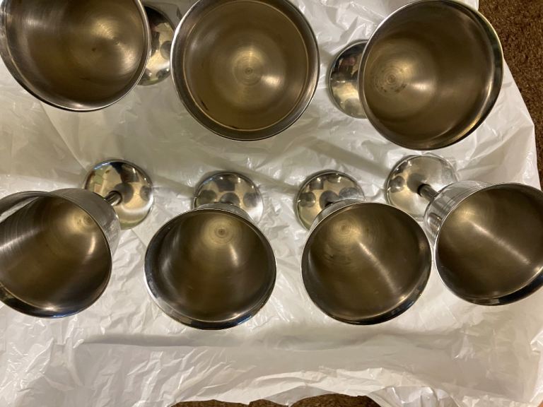 Set of 7 Stainless Steel Vintage Wine Goblets. Great Condition. Diameter 7 cm. Height 14 cm. Never been used just stored/display. Some tarnishing in places due to age.