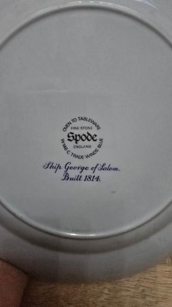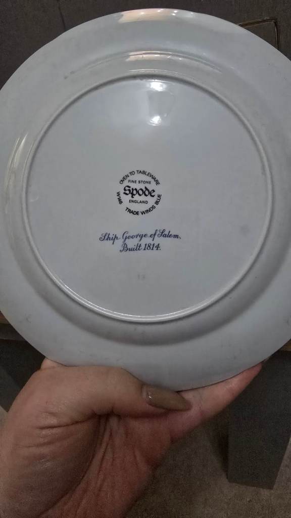 The plate showcases intricate detailing of a ship named George of Salem built 1814 backstamp is printed on each plate for authenticity.