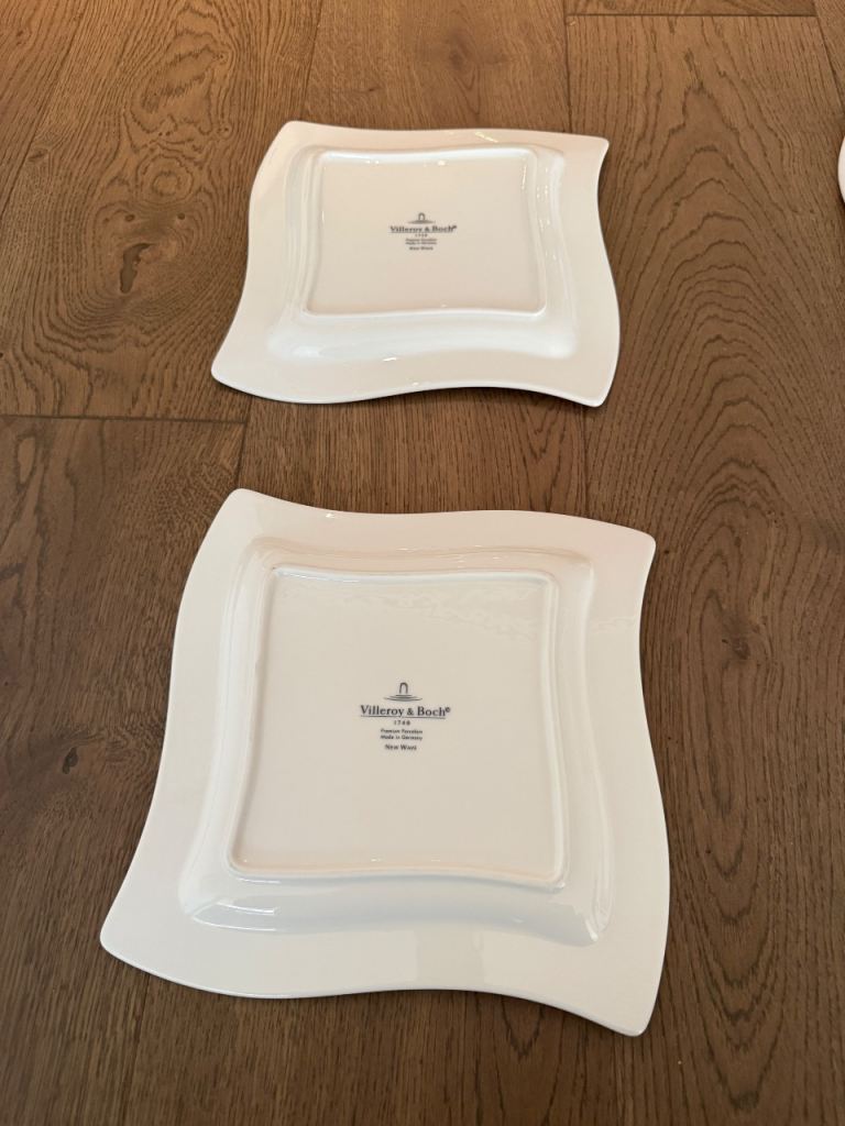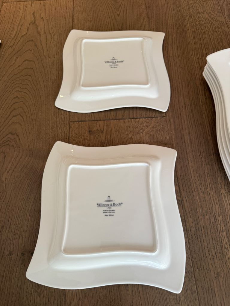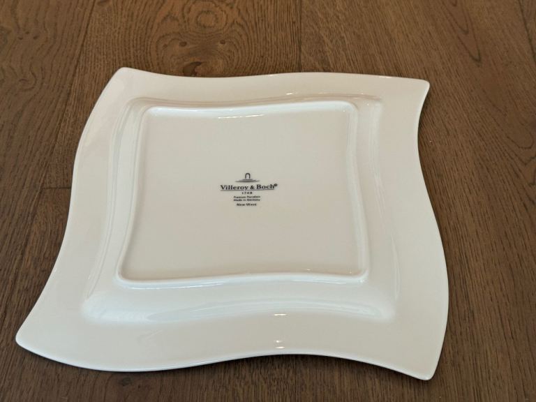 Elegant and modern Villeroy & Boch “New Wave” porcelain plates featuring the iconic curved square design. These high-quality plates are perfect for contemporary table settings and entertaining.
