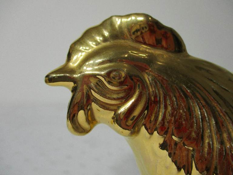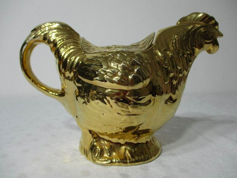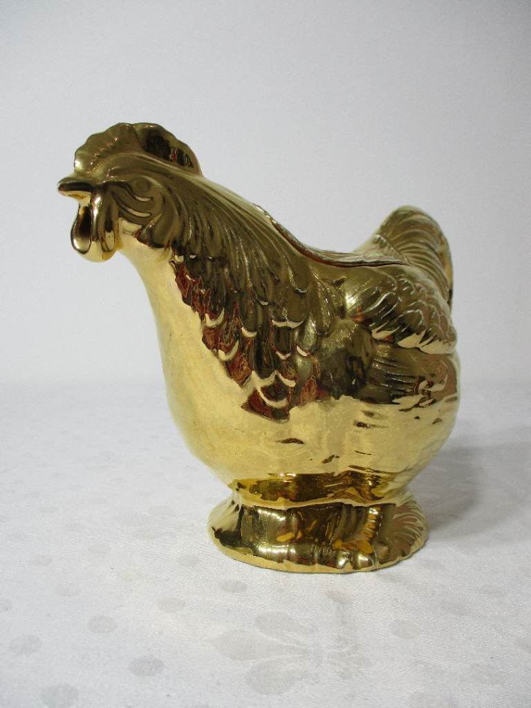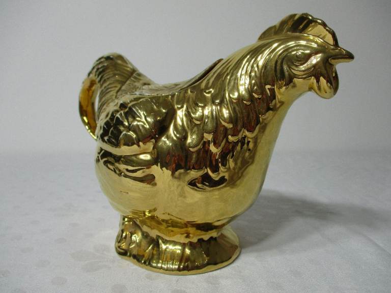 This vintage 1930s Royal Winton Grimwades Gold Lustre Rooster Novelty Teapot is a charming piece of ceramic dinnerware that hails from the United Kingdom. The teapot features a unique rooster pattern in a striking gold colour, making it a standout addition to any collection. With its original glazed finish and novelty style, this teapot is sure to delight collectors of vintage kitchen items from the 1920s-1949 period. Perfect as a decorative piece in a traditional kitchen setting, this one-of-a-kind teapot is a true gem for those who appreciate classic British design. Approx 24cm wide x 16cm tall. There is a little bit of wear to the gold lustre in places (as photographed). Otherwise, lovely vintage condition, with no chips or cracks. Please text or message if interested (text preferred).
