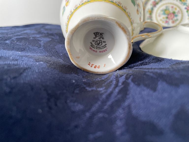 Lovely vintage Foley Ming Rose floral tea set up for grabs. Includes a teacup, its saucer, and two matching plates.