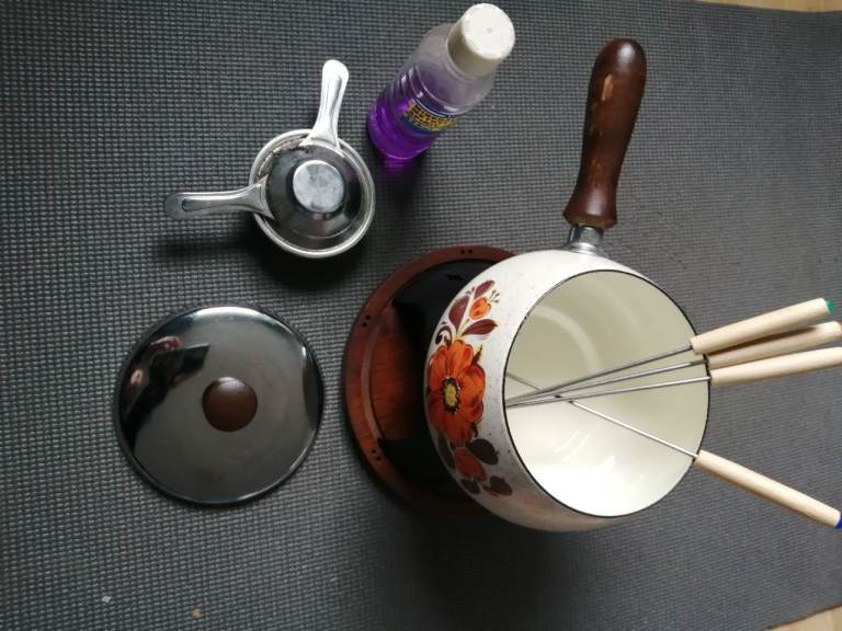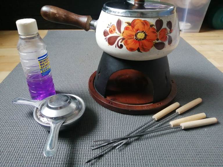 A lovely vintage fondue set with its decorated earthenware pot, wooden support, metal stand, warmer and picks. Comes with mineralised methylated spirit (half a bottle) to light it.
