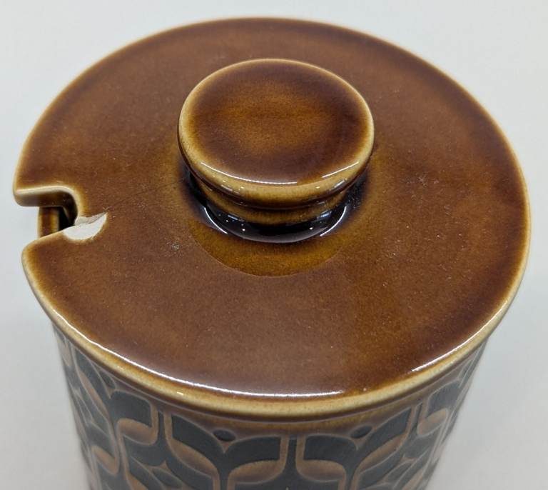 * Jam pot with lid and spoon hole (chip on top of lid near spoon hole)