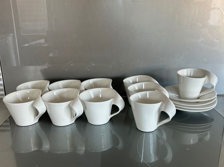 Saffron - 6 cups, saucers and side plates, milk jug, preserve/mustard jar & vinaigrette jug