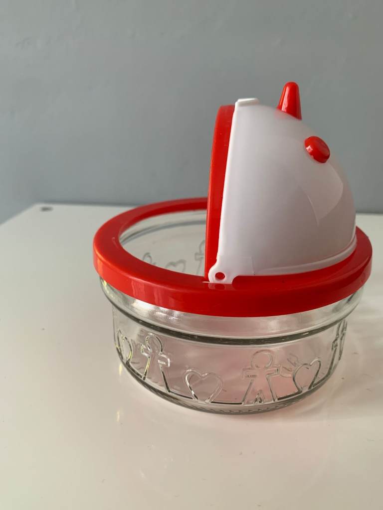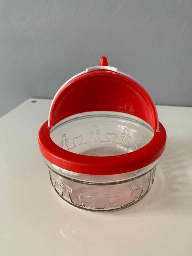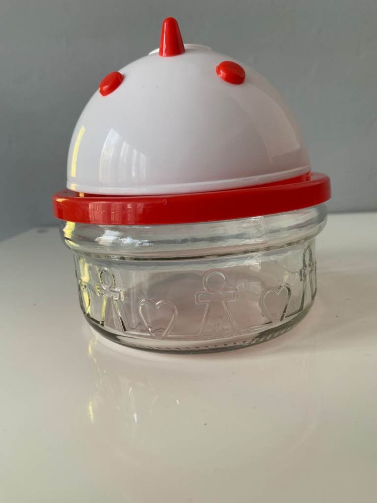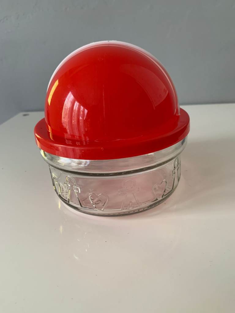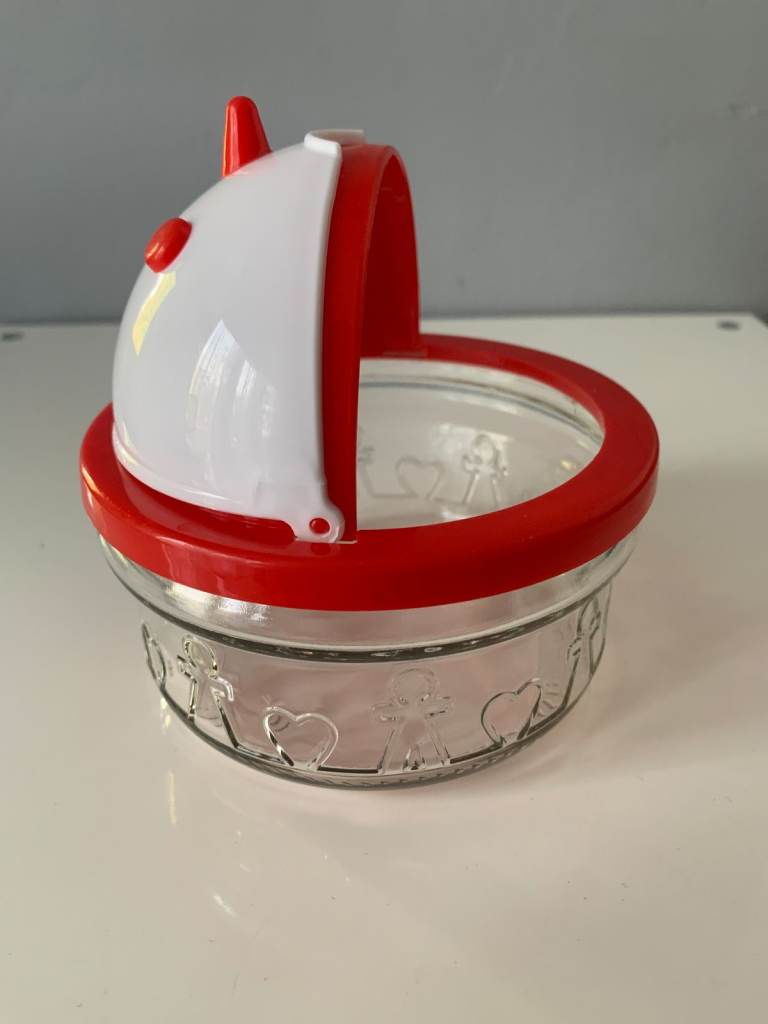 Quirky vintage novelty sugar bowl featuring a clear glass base and a bold red lid designed with a white face, red eyes, and nose. A fun and unusual piece that adds character to any kitchen or display.