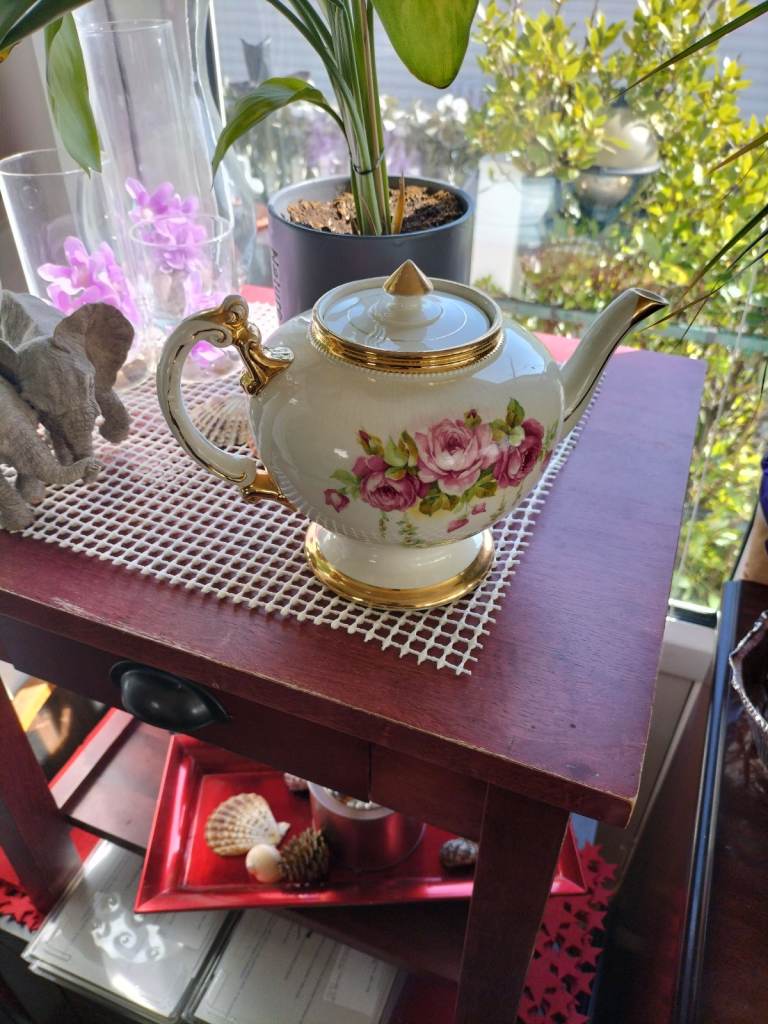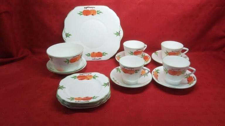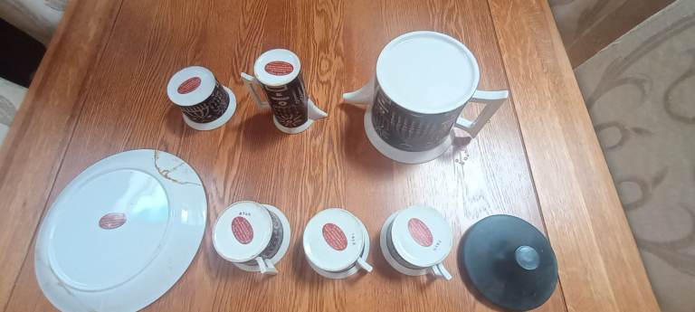 The tea pot has a couple of small (2-3mm) chips, the milk jug has a chip on the outer rim approx 12mm wide and a discoloured crack inside approx 5cm long, the sugar bowl has a chip on the outer rim approx 7mm wide.