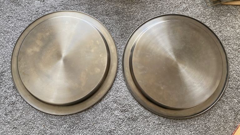 Pair of vintage stainless steel platters with raised rim