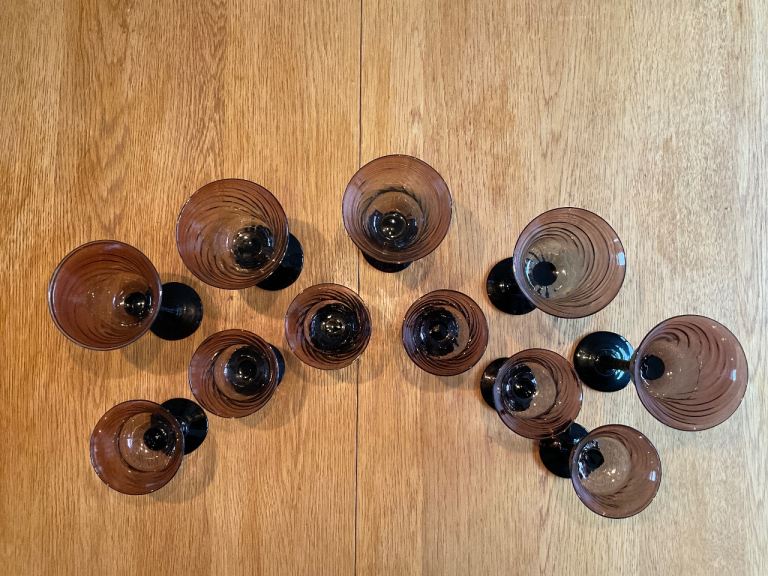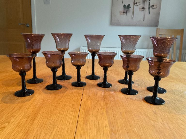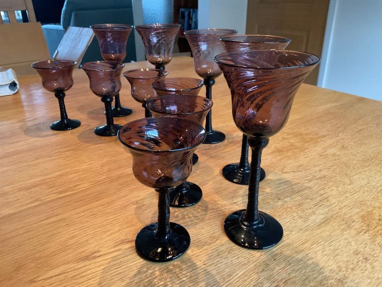 A collection of stunning glasses .all individually different as they were hand made,in a dark mauve colour that would grace any dining table or bar.