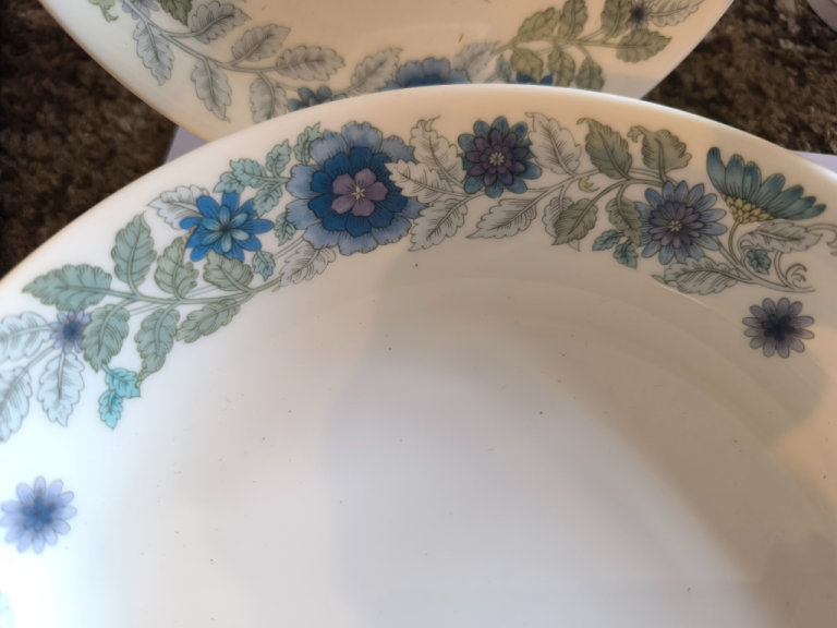 Two tea plates and two bowls. Made by Wedgewood. Excellent condition. Flower pattern around edge