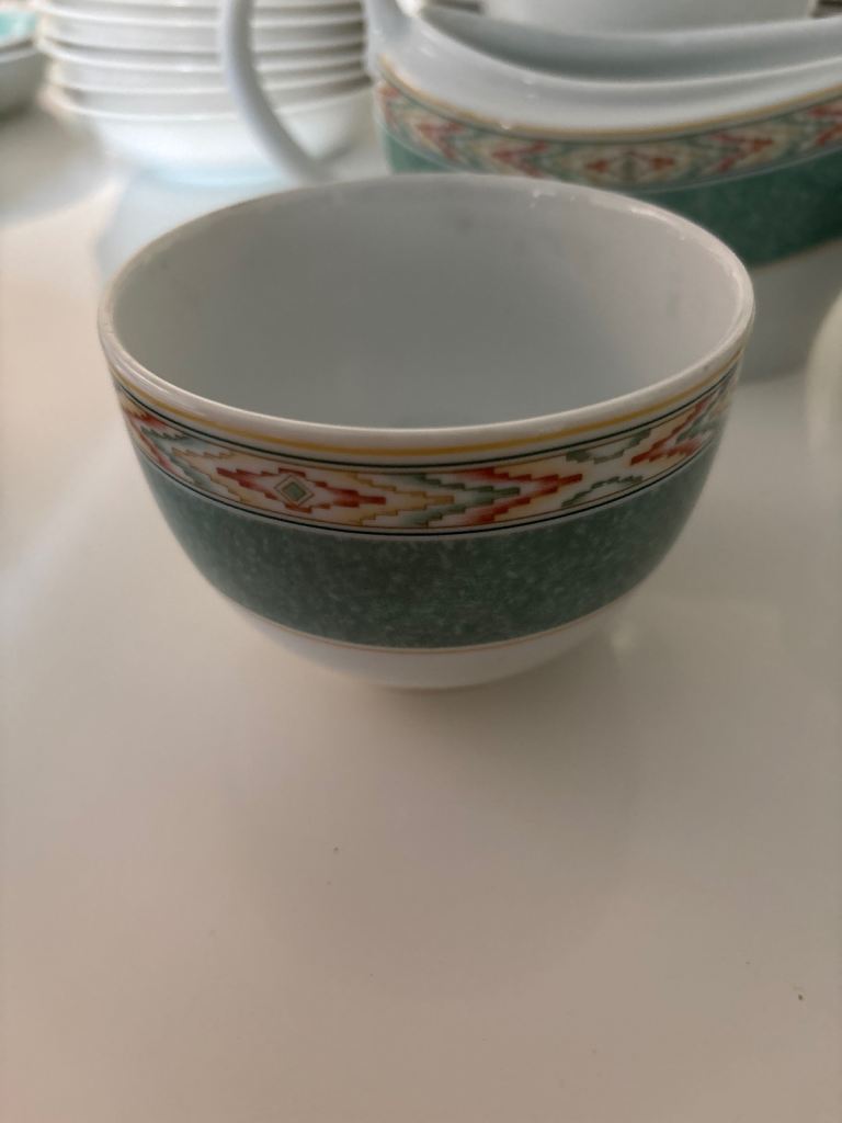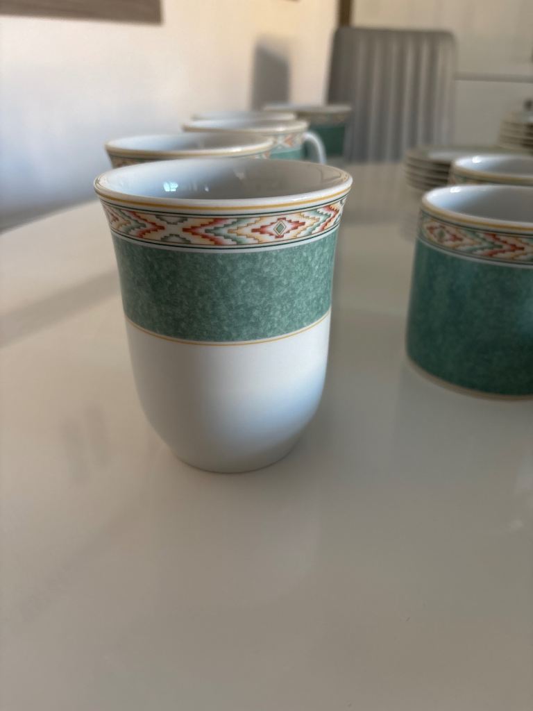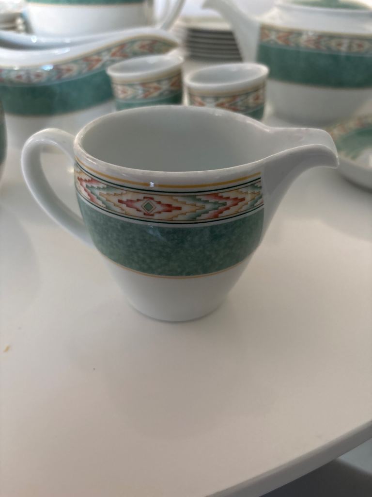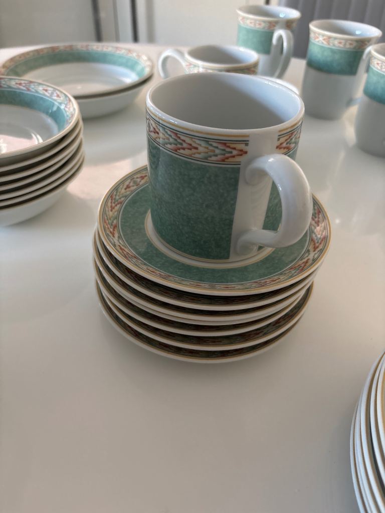 A large collection of attractive Wedgwood crockery in fine bone porcelain. The set includes plates, mugs, teapot, coffee pot, dishes, bowls, mugs, cups and saucers, gravy boat and snack dish. Can be separated., or just £20 for all.