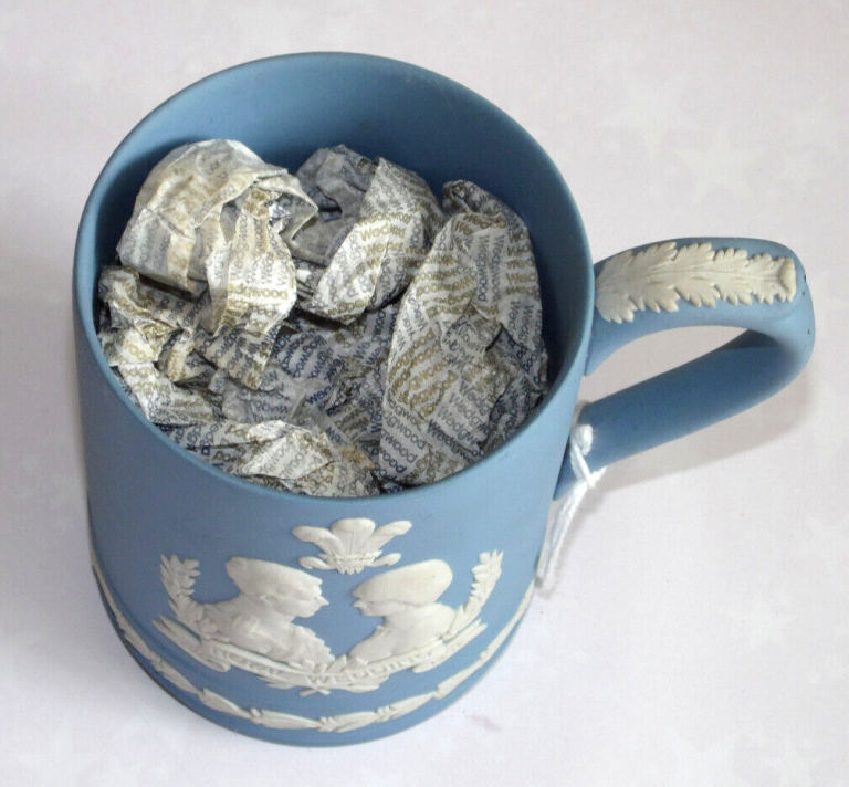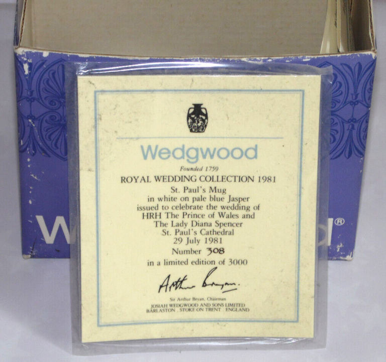 WEDGWOOD JASPERWARE WHITE ON BLUE ROYAL WEDDING & ST PAUL's MUG CERTIFIED AND BOXED IN EXCELLENT CONDITION