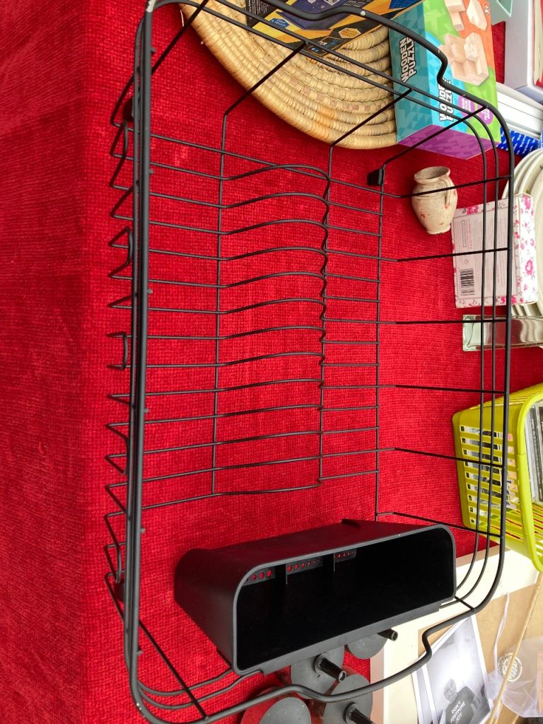 Black metal draining rack with cutlery holder. Brand new. Very slight chip as it fell off the table!