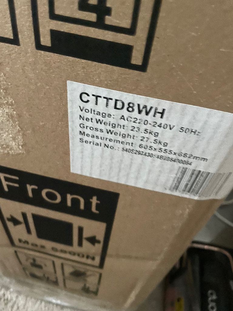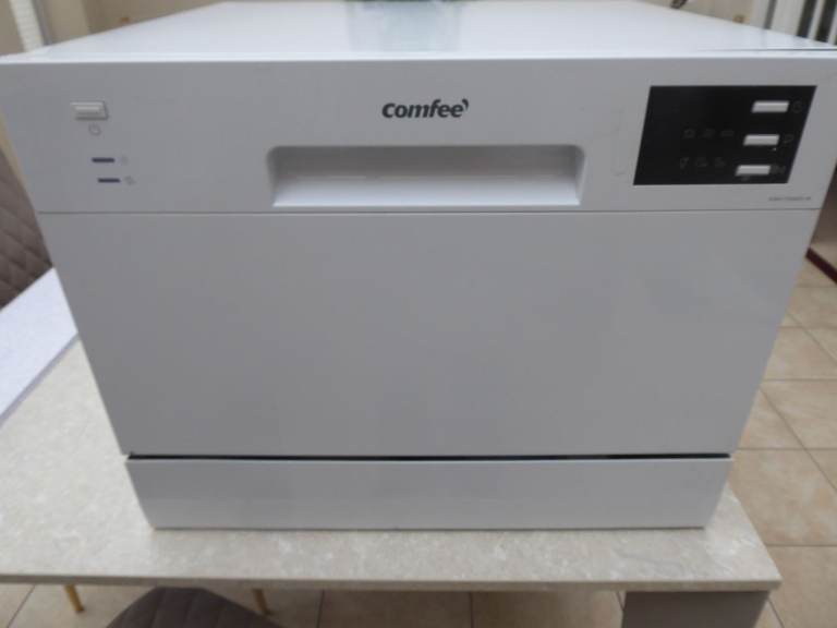 Small square dishwasher would fit in unit or on worktop, freestanding.