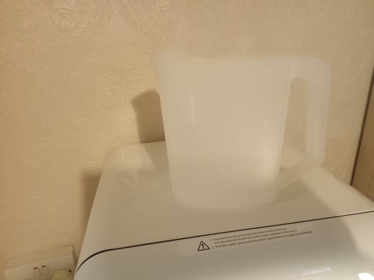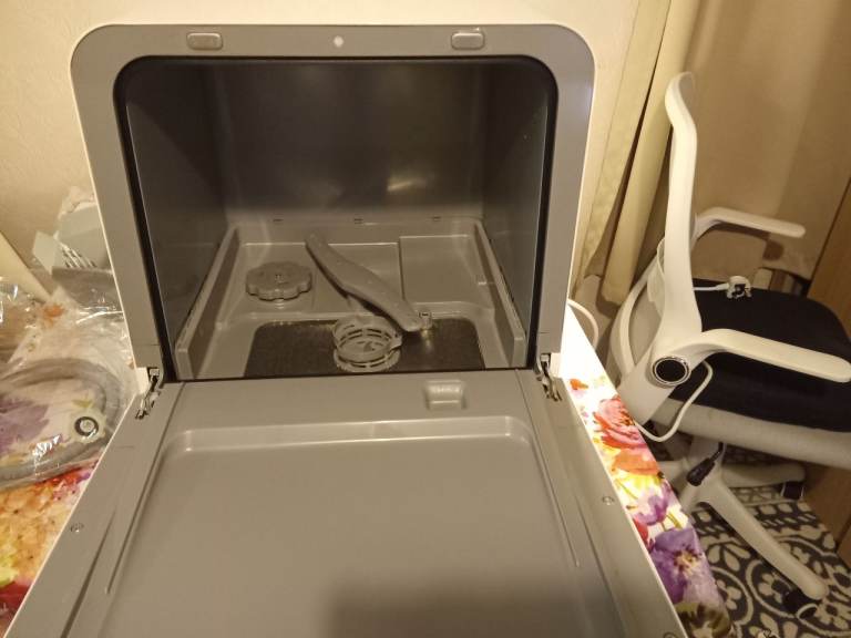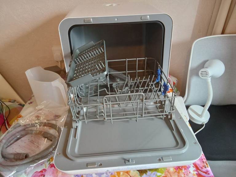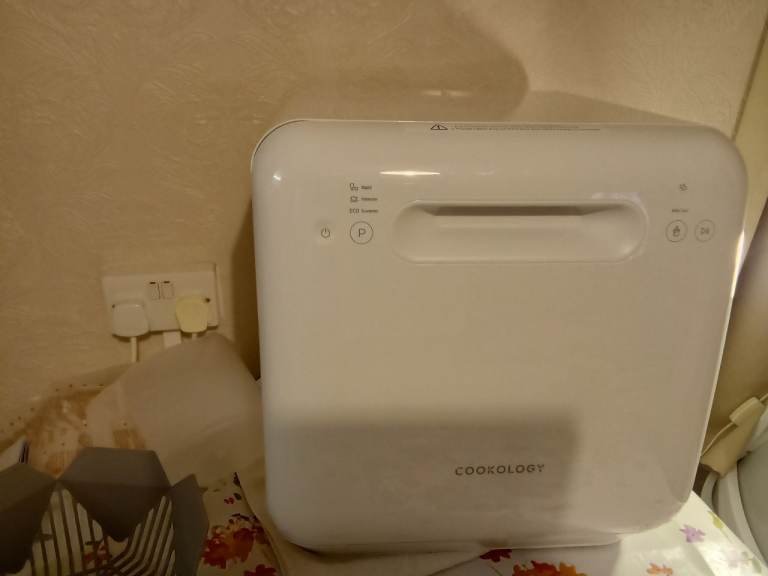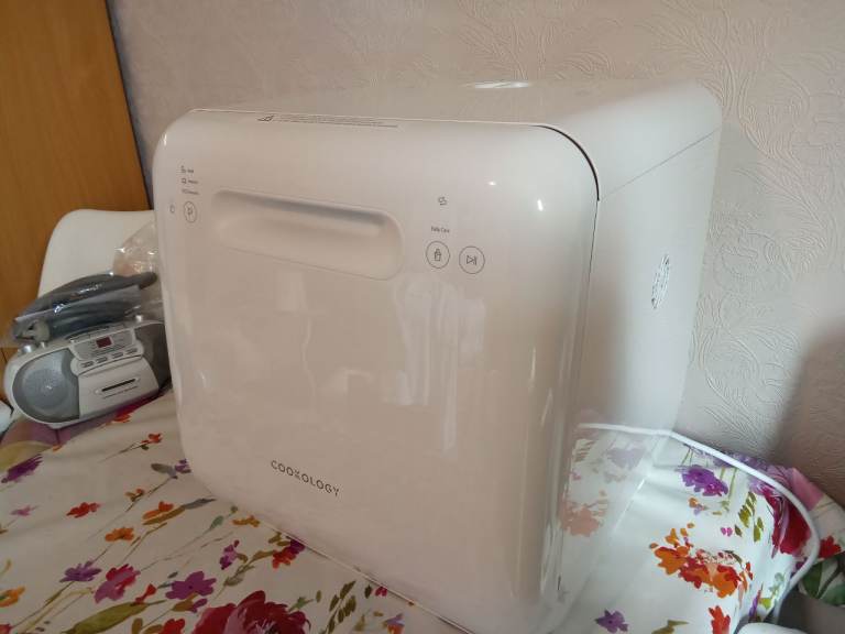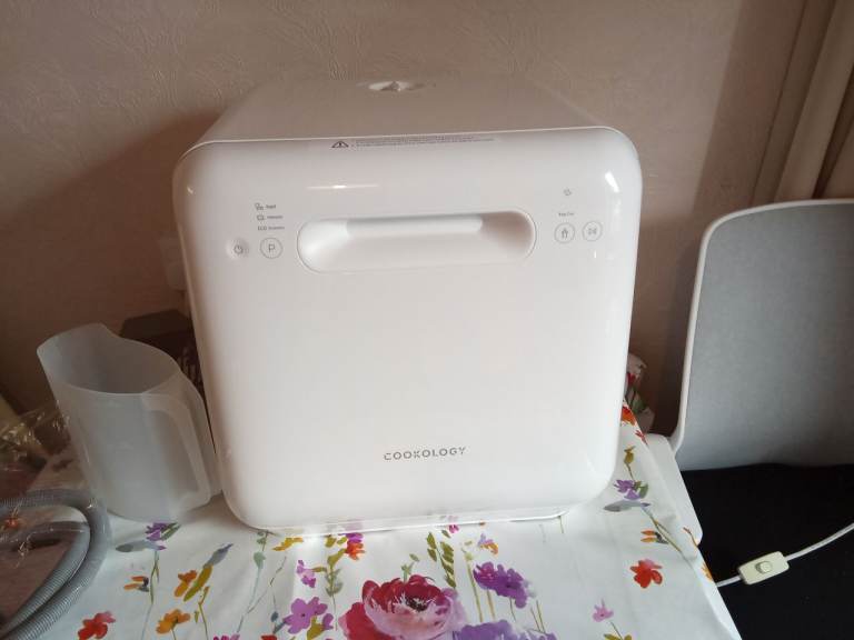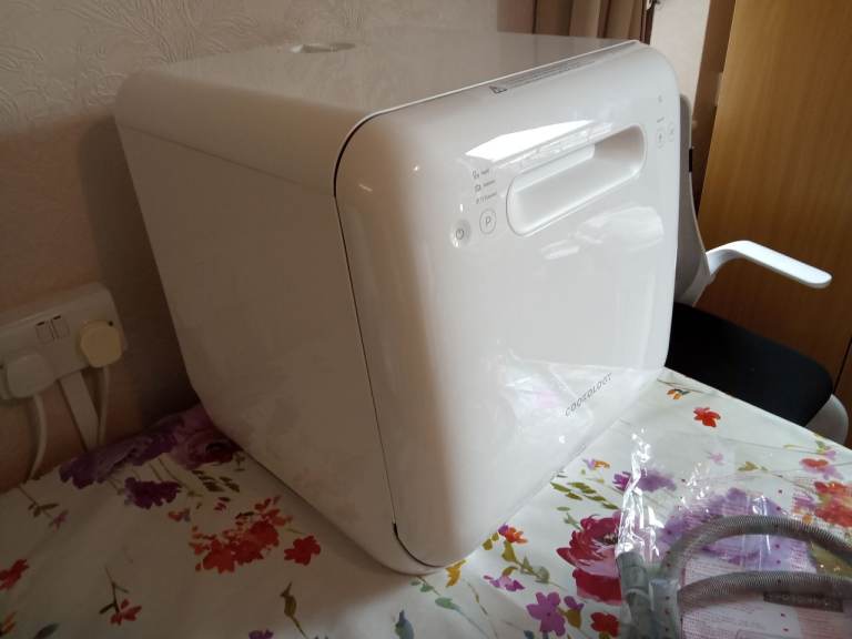 Cookology tabletop mini Dishwasher, Model MCDW2WH, white, 2 place settings. Does not need plumbing, so can be placed anywhere. Fill with water from the top, or if wished, there is a hose which can be connected to a tap.