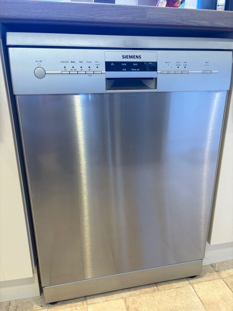 Siemens freestanding dishwasher in brushed silver. With eco and quick wash cycles. In good condition, apart from some minor marks from wear and tear on inner door.