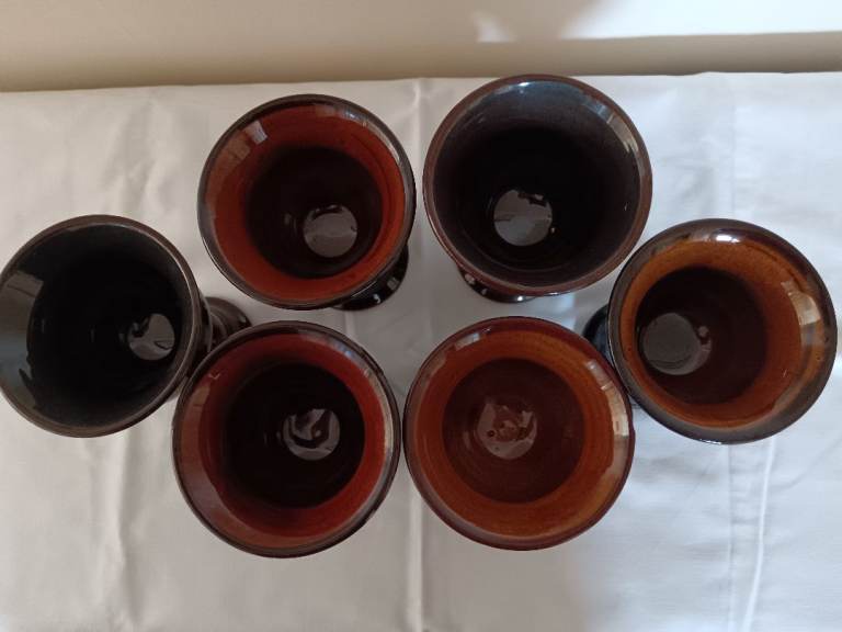 6 handmade pottery drinking goblets. Smooth glazed finish.