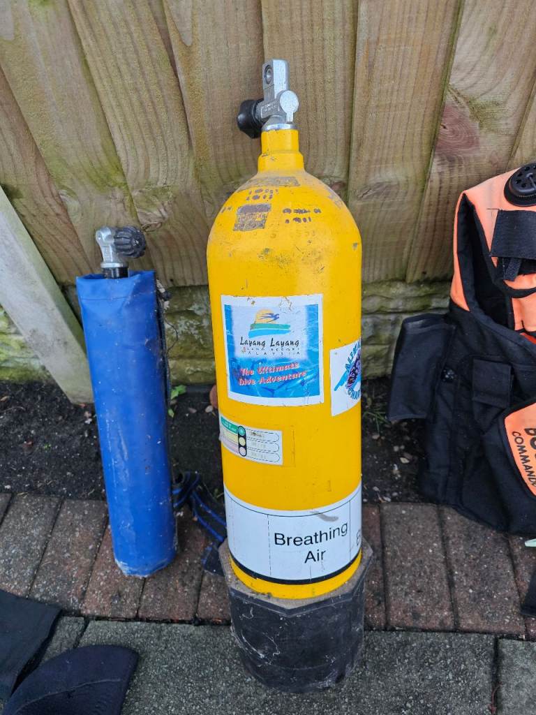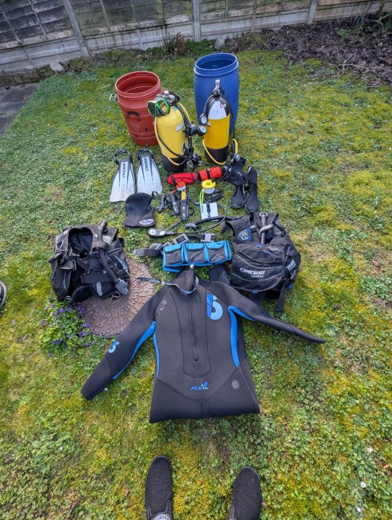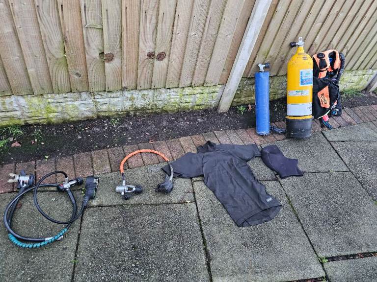 Diving equipment...used but in good condition...3 air tanks...15litre, 12litre and 10litre safety. Full harness...3 sets breathing/tank connectors, some garments. Open to competitive offers...circa £350...2 used tanks cost that