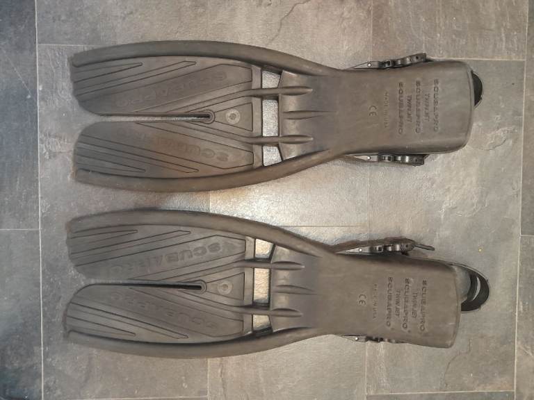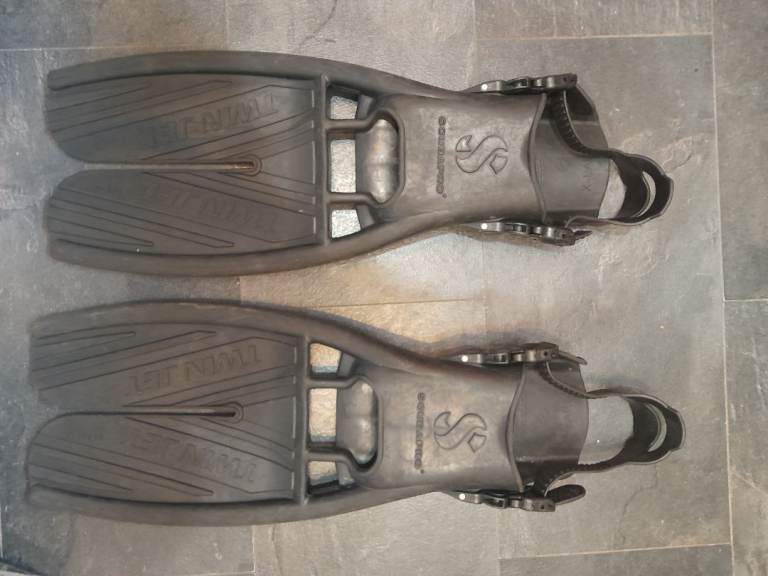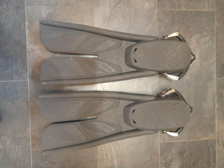 Fins in good condition, both are size Xl. Heavy rubber construction. The Ist fins have steel spring straps.