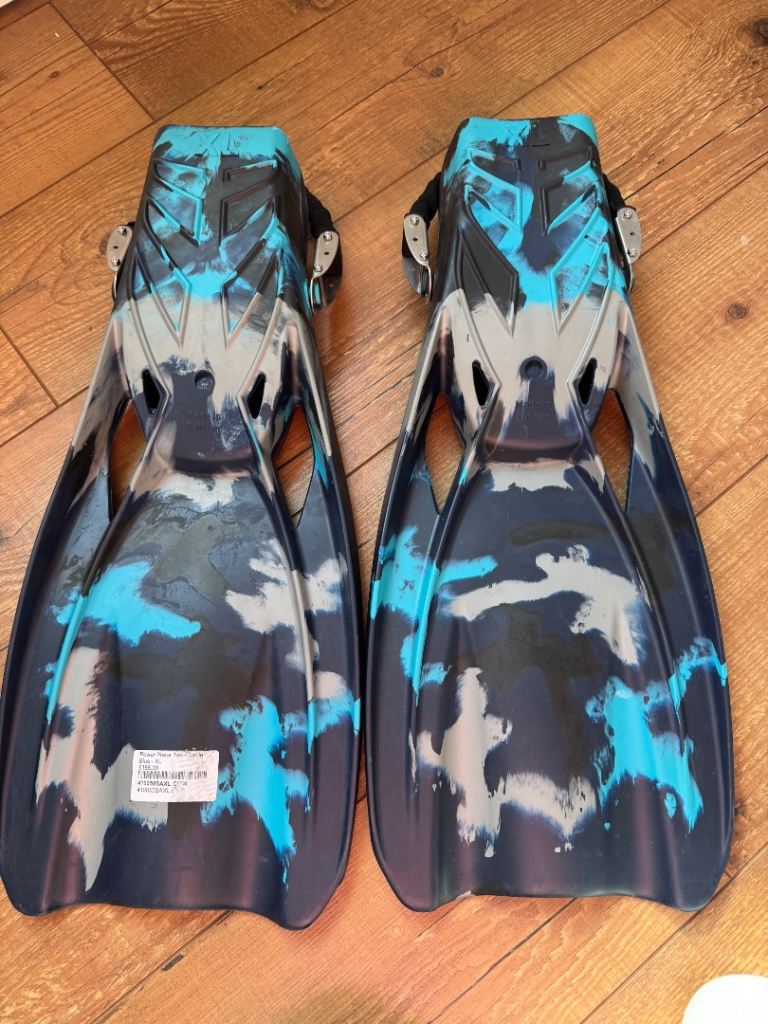 Pair of Power Plana Tec Battle fins in size XL, featuring a blue camouflage design.