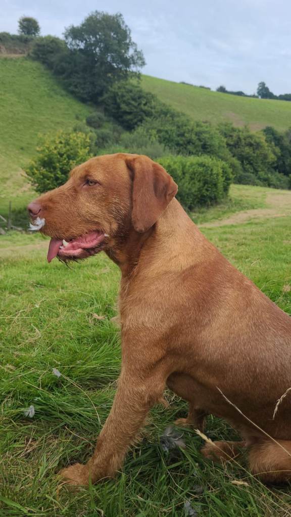The sire, Vigo, is a handsome Smooth-haired Vizsla, full of energy, fun, and mischief. Like Bertha, he loves days on the local shoot and is a friendly, confident family dog.