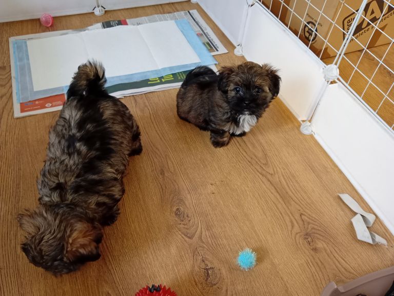 Toilet trained to go on puppy pads and newspaper. Louis is very good but Diego still misses the target at times.