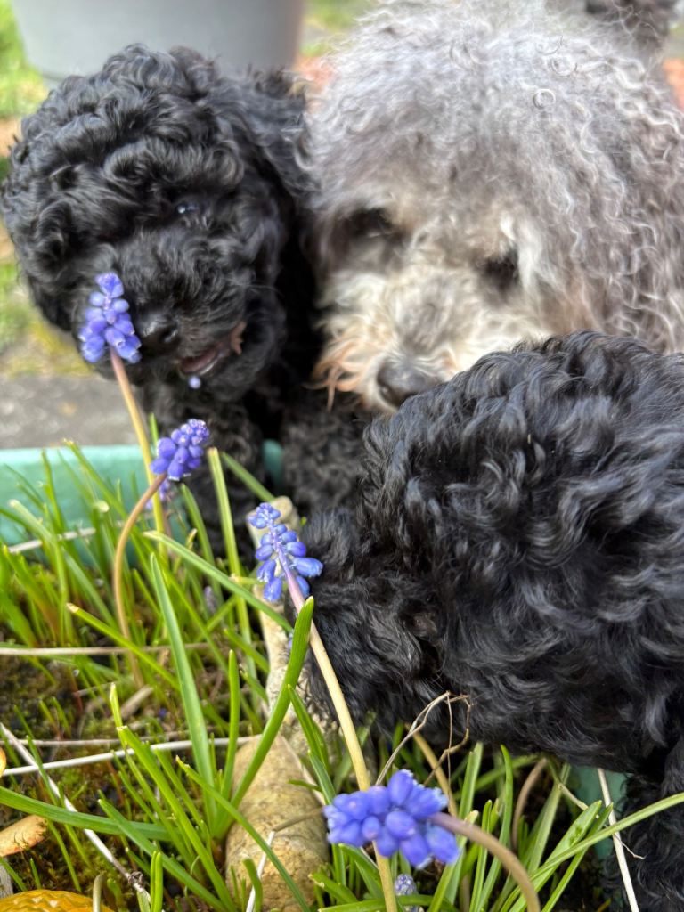 These puppies are F1b Mini Jackapoos (7/8 Miniature Poodle and 1/8 Jack Russell), meaning they are more likely to have a low-shedding, allergy-friendly coat while still keeping a lovely, playful temperament.