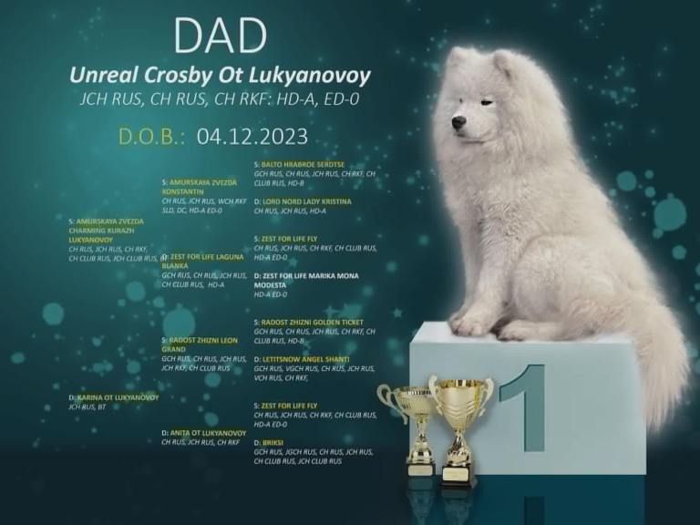 Samoyeds are known for their friendly personality, intelligence and beautiful white coat. They are wonderful family dogs and very affectionate companions.