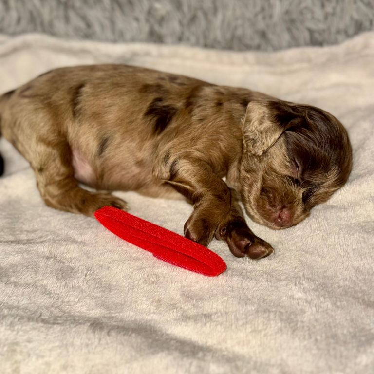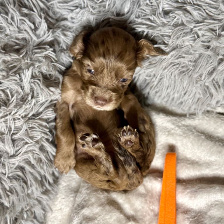 Puppy 1 - Light Blue Boy 🩵 Tri - Colour Caramel, Chocolate Dots & White Chest with gorgeous White Head Stripe!