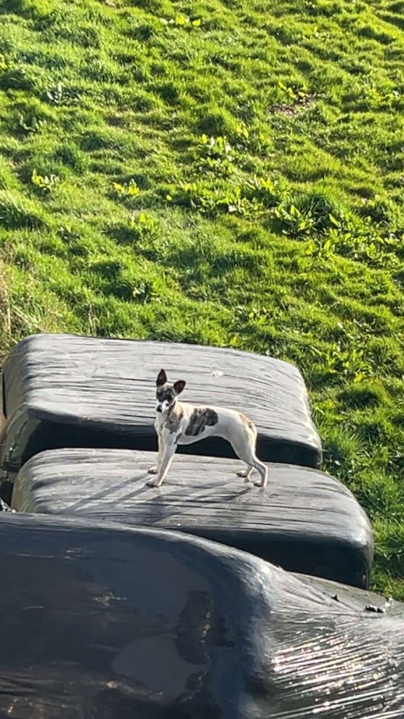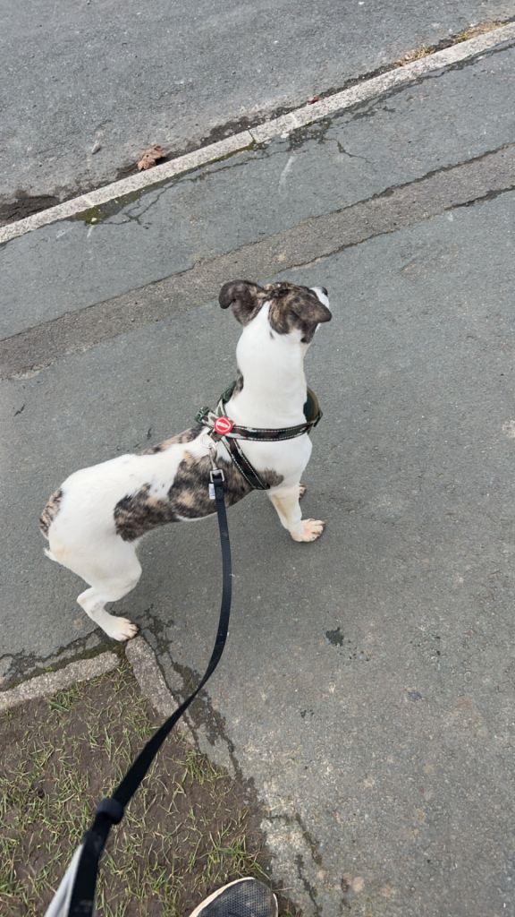 Posting for under a month1 year old female white and brindle pure kc reg whippet