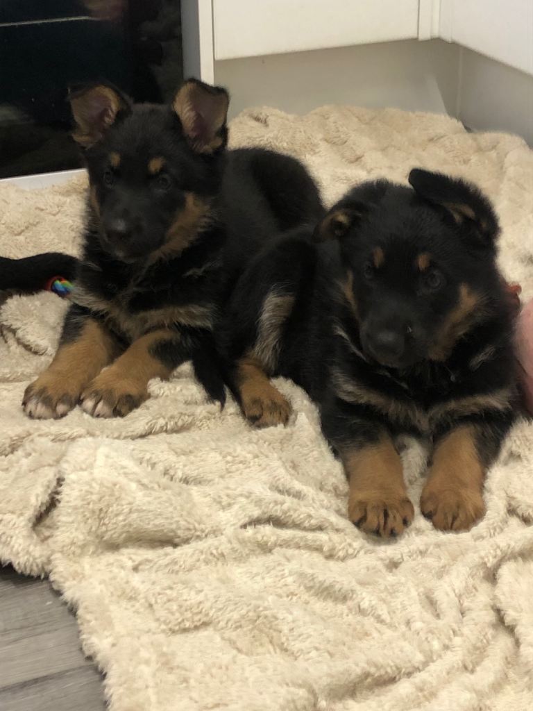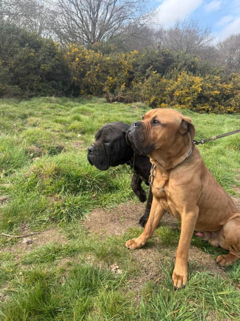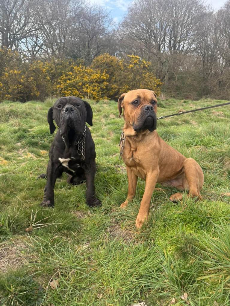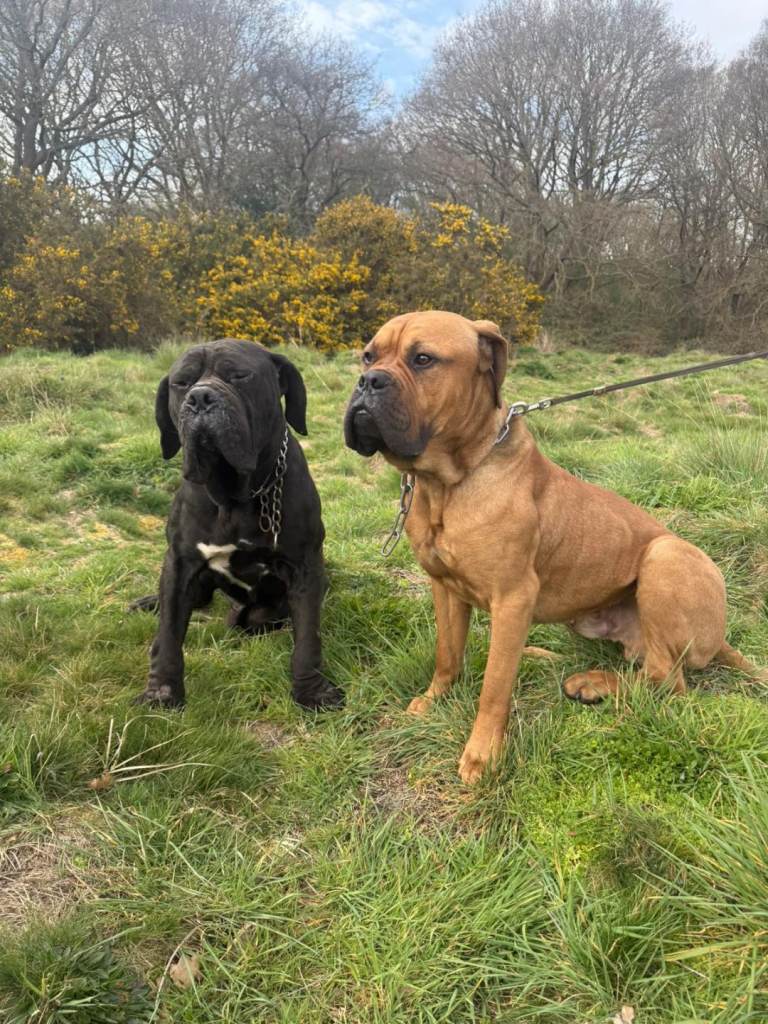 Im looking to sell both of these dogs for a fair price. They are strong loyal and protective. The black one is quite unfriendly to new faces but he is still strong. The brown one is lovely with people and gets excited when he sees new faces.