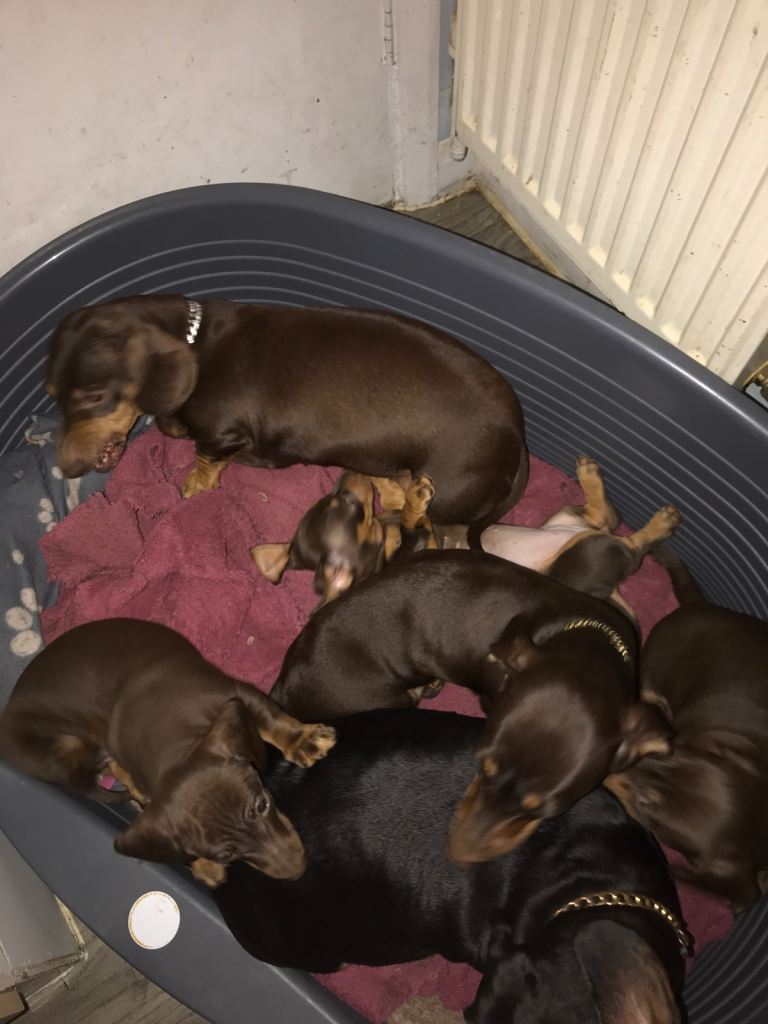 Got 3 Handsome,Miniature, shorthaired dachshund pups,,two girls ,one little boy ,the three of them ,are all the same colour ,brown and tan, same as dad and mum, they are asleep at the moment with their mum ,their nan and their big sister,, The Dad belongs to a proper stand firm,, their mum is my pet she’s five years old ,she will never have any more Pups ,,as much as I love puppies,,this will be the last puppies I bread,,I’m a pensioner now I’m not very well,, but over the years I have bred some beautiful Pups,, my name is Mark ,give me a ring if you need to know anything else ,thank you,