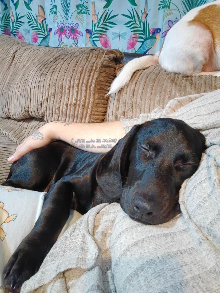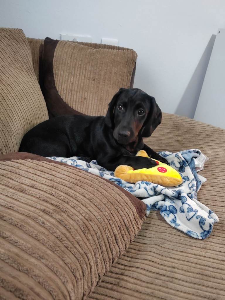 He has a lovely temperament, soppy and loving. Loves a cuddle and a play. He would do with some toilet training as he has had a few accidents over night but in the day he has been very good as we let him in the garden every hour or so.