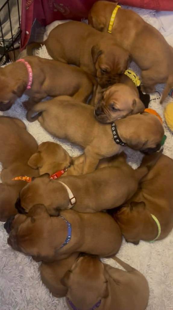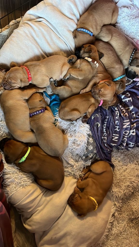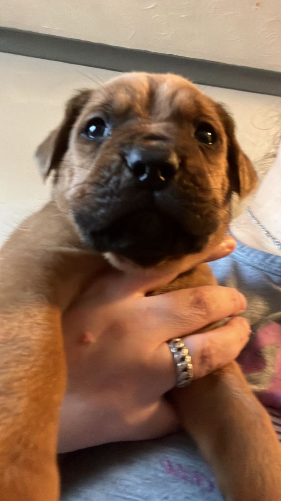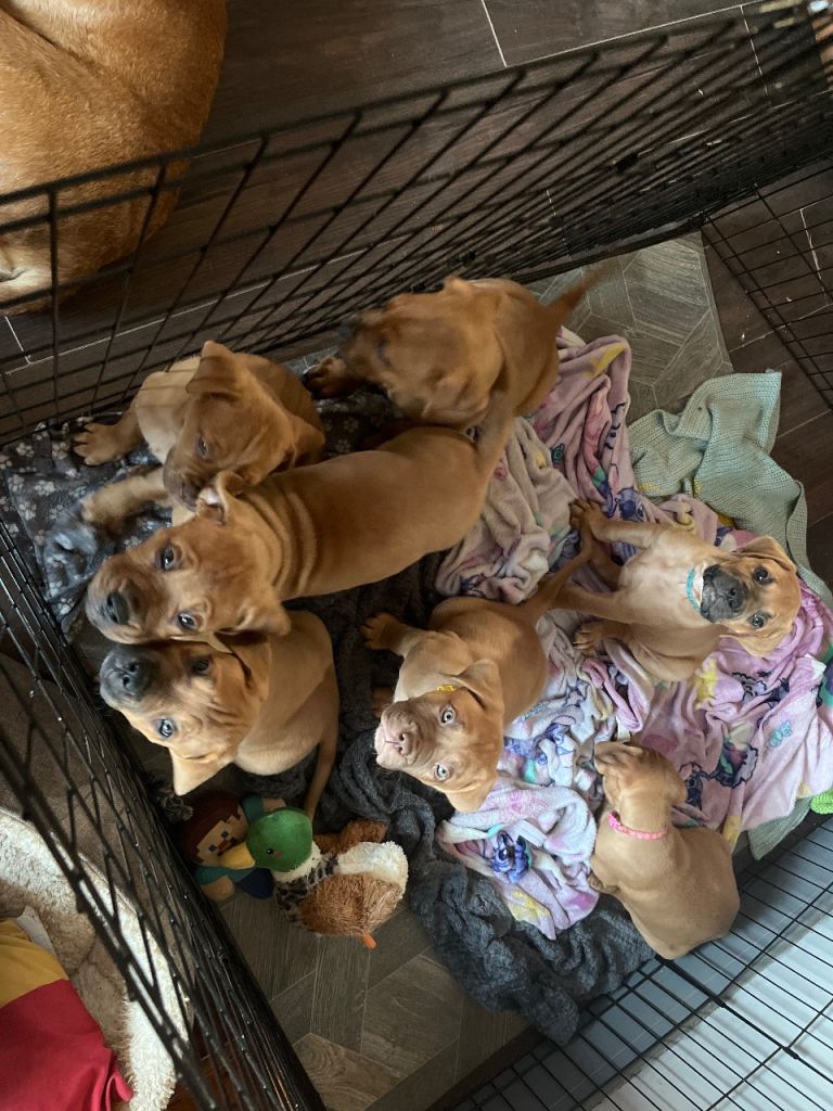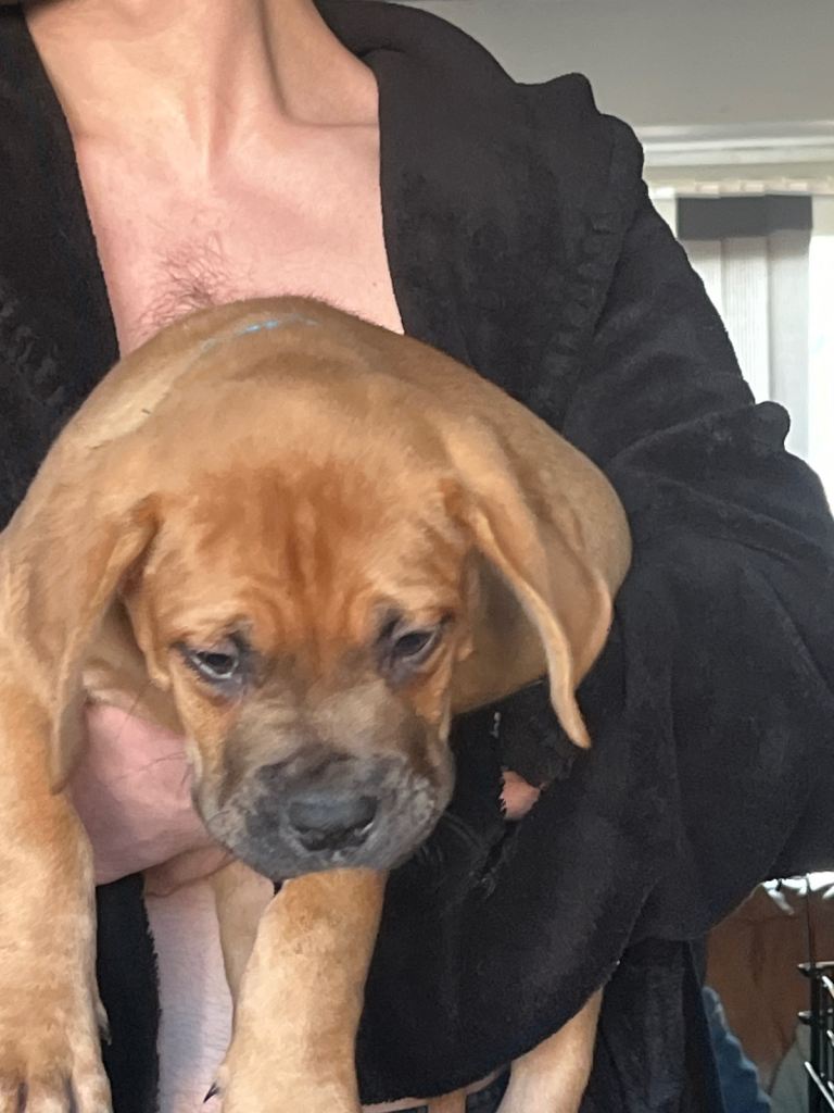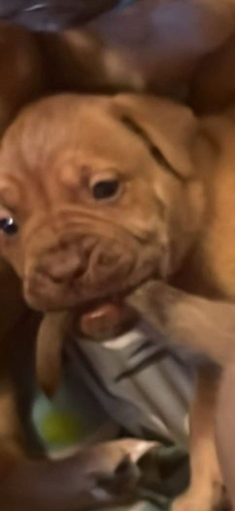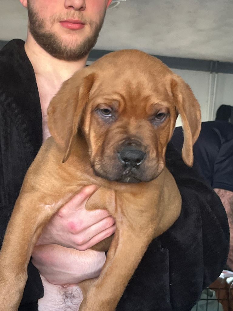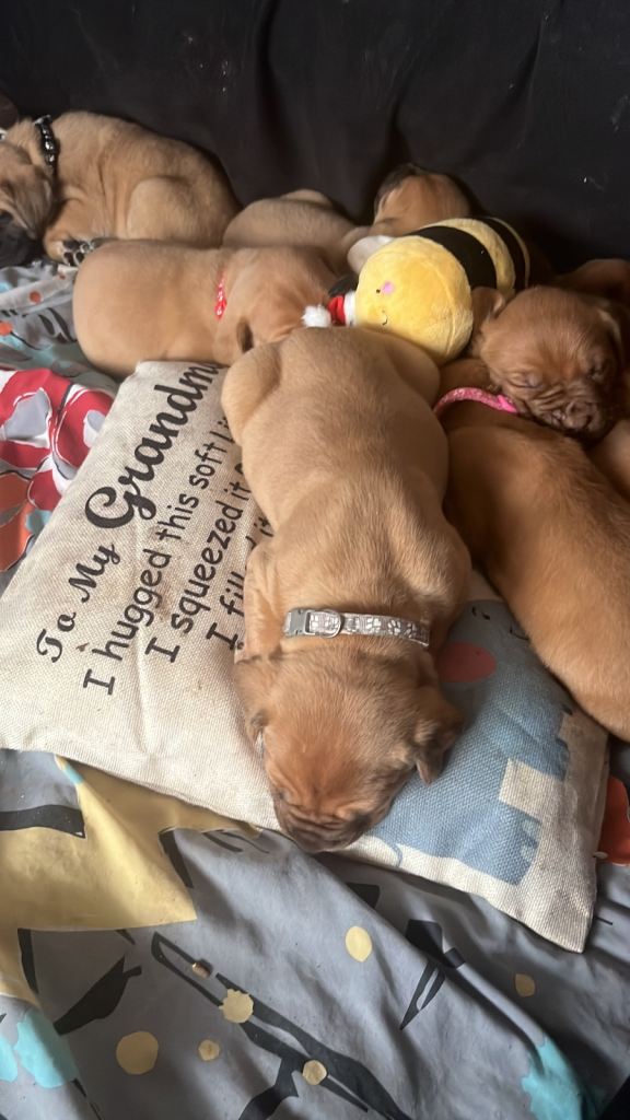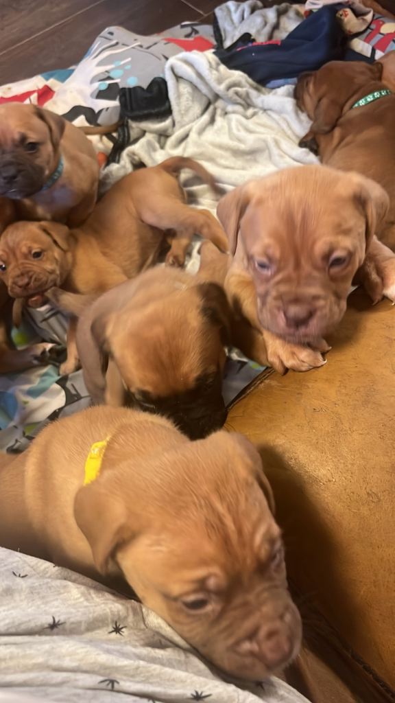 Hi our family dogue de Bordeaux has had her first litter of 12 beautiful puppies. 5 males and 7 females. We have left 2 males and 4 females.