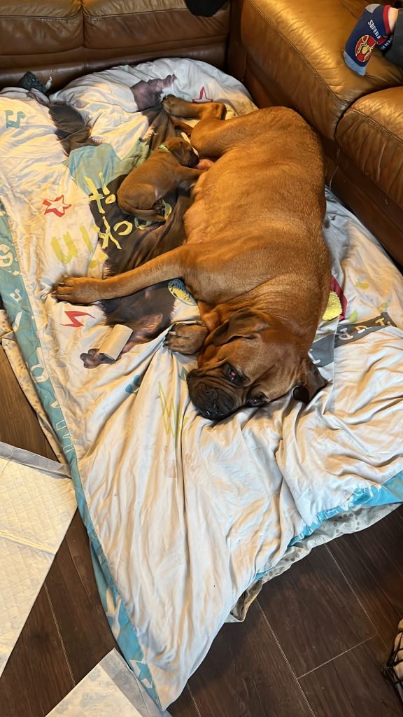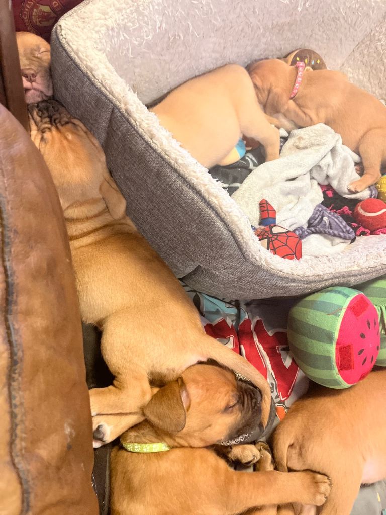 A bit about mum and dad both are pure breed dogue de Bordeaux’s mum is KC registered dad isn’t (as mentioned above). Mums been with our family since she was 7 weeks old and has been brought up around an array of children. she has a great temperament, she a beautiful black masked Dad is our friends dog and our Bordeaux’s best friend again he’s been brought around children and his temperament is amazing🥰