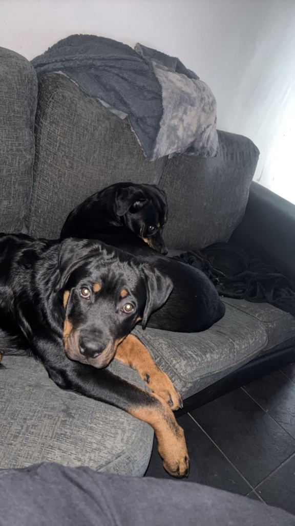 Pure bred Rottweiler male last in litter, cheaply priced due to urgent sale needed as he’s trying to mount his mum and she’s clearly displaying signs she’s not happy about it. Is well associated with cats and other dogs. I cannot share how he will be around children due to not having any however a very happy, healthy puppy! Fully flea & wormed and microchipped ready to go.