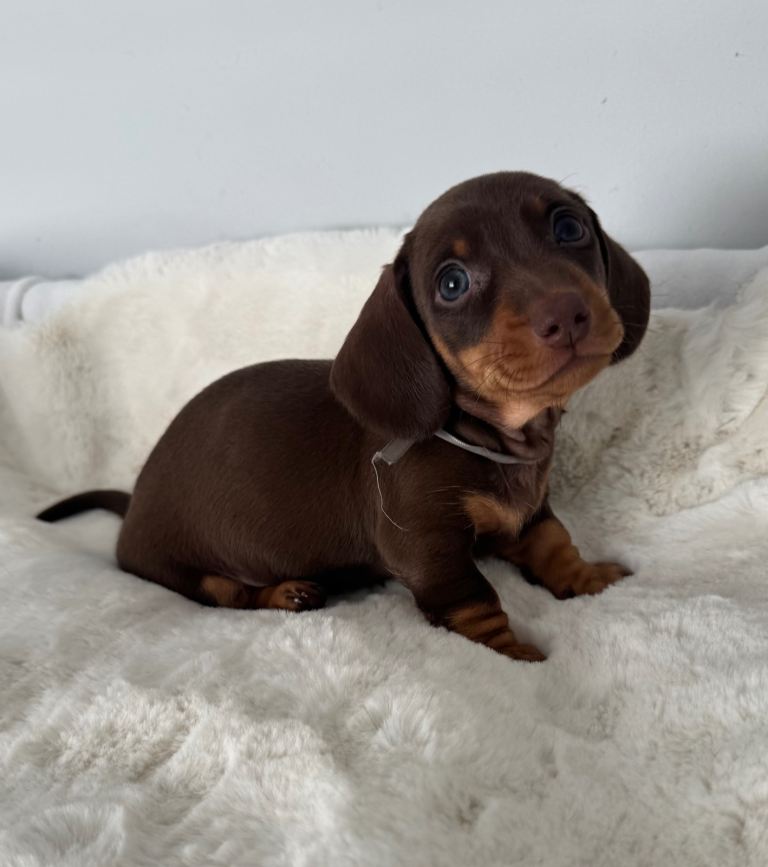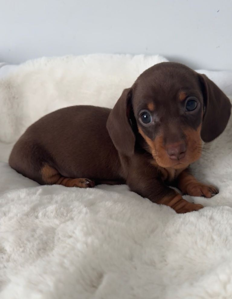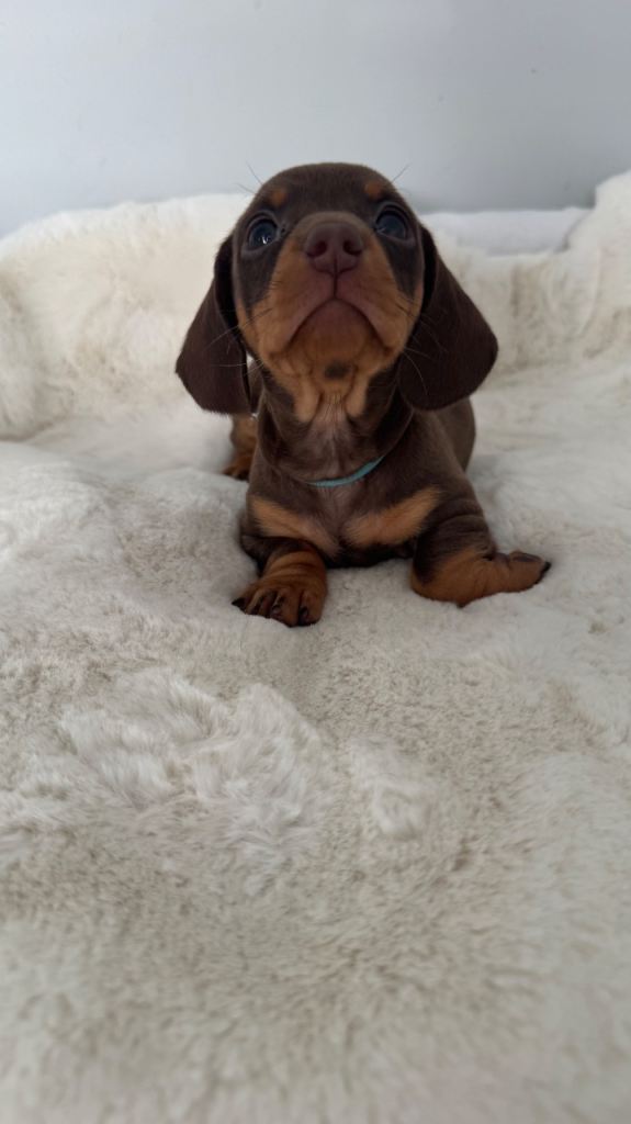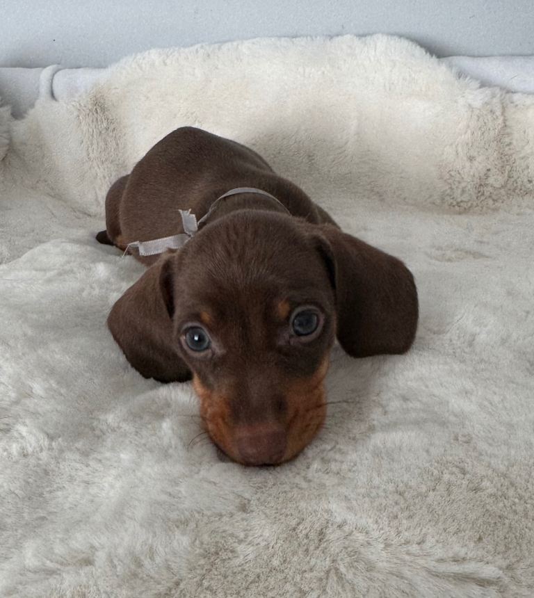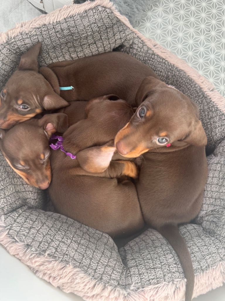 4 beautiful chocolate & tan miniature dachshund puppies looking for there forever homes.