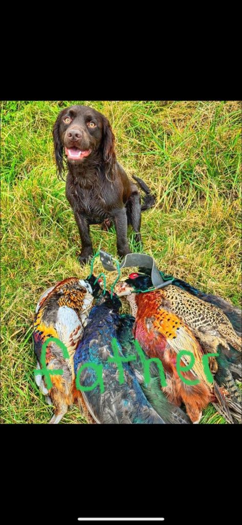 Mother, very agile and active, chocolate Cocker Spaniel with white chest.