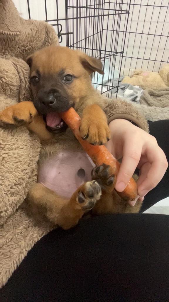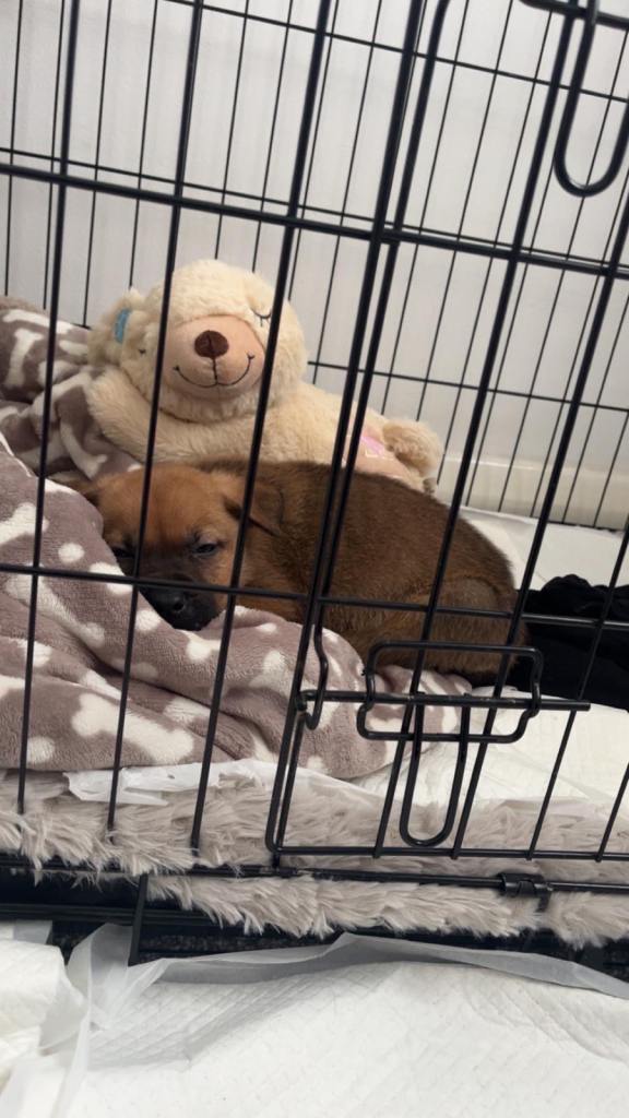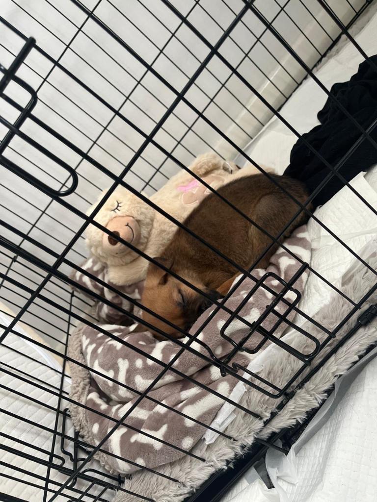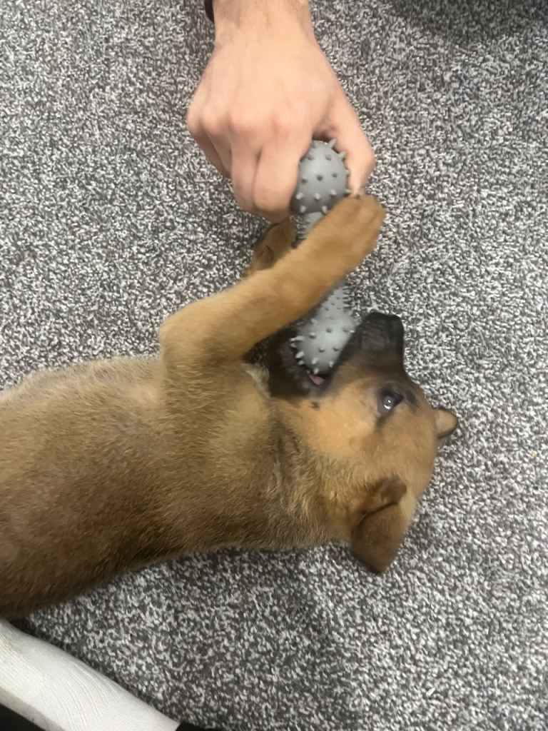 -Has learnt sit, paw, ‘go potty’, ‘crate’ and is practicing ‘stay’