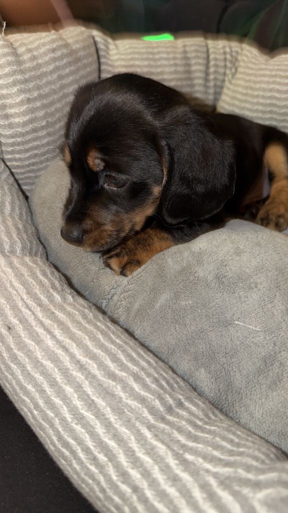 Due to no fault of his own we’re looking for a new family for our 9 week old mini dachshund. We got him as a second dog but our large breed dog is just to much for him and I’m scared he will get hurt being so small this is a mistake on my end and not his . We named him Rolo only had him one week so no jabs or microchip yet . Will come with bed , toys bowls and royal canine kibble x 2 bags Also a box of puppy pads Any questions please ask .🐾