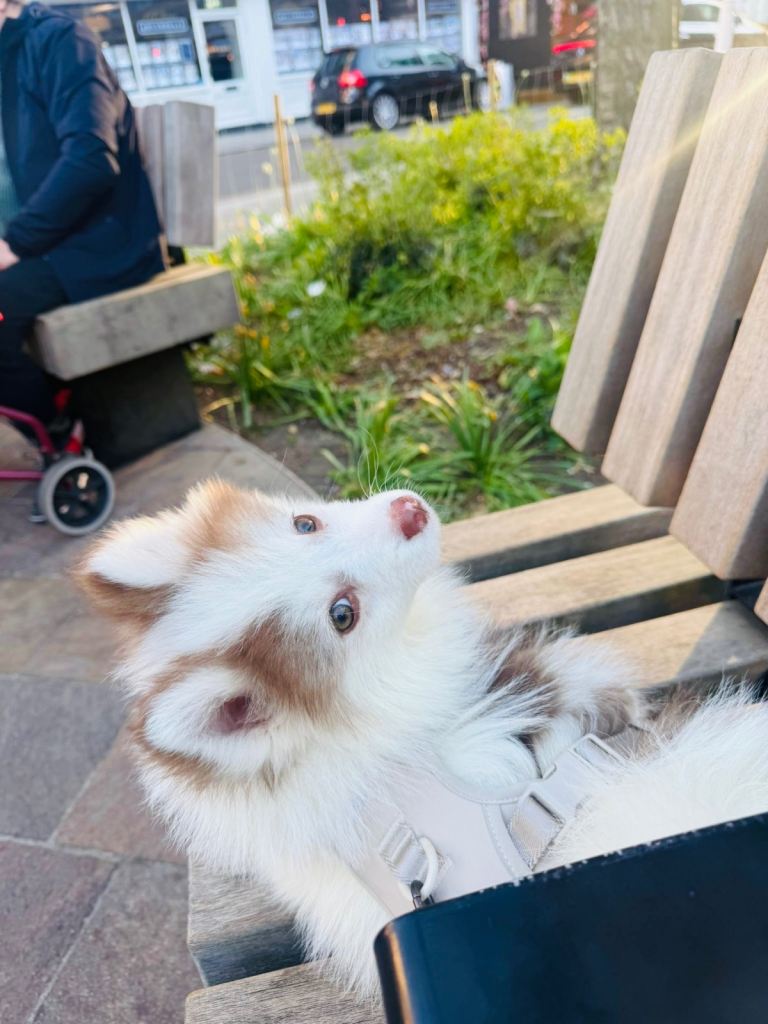 Lovely Pomsky puppy with a striking chocolate-and-white coat, bright expressive eyes, and a fluffy soft coat. Friendly temperament, playful nature, and great with people—an ideal loving companion.