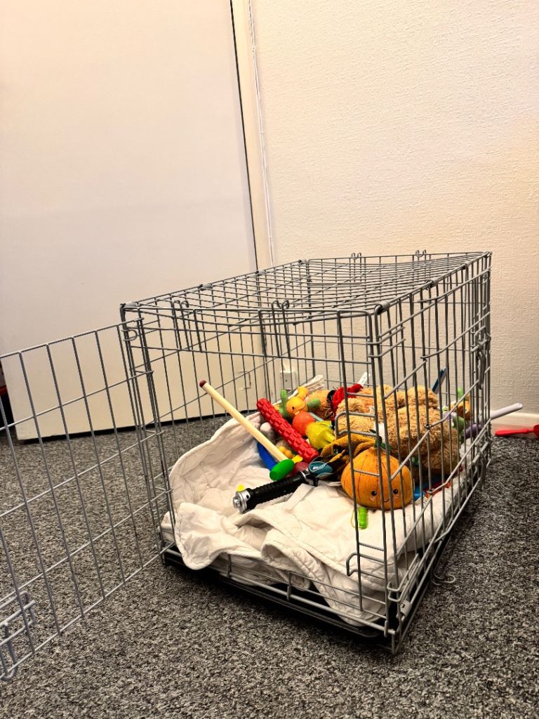She will come with all her toys, her large metal crate, leads, food, bowls, and everything she has.