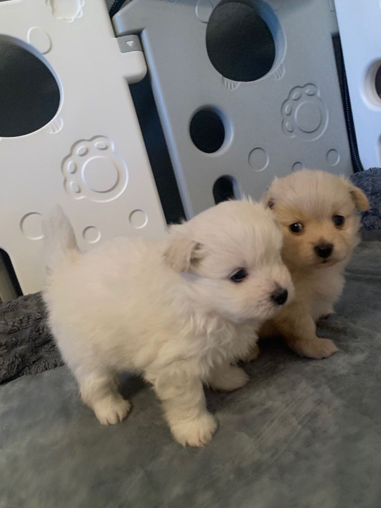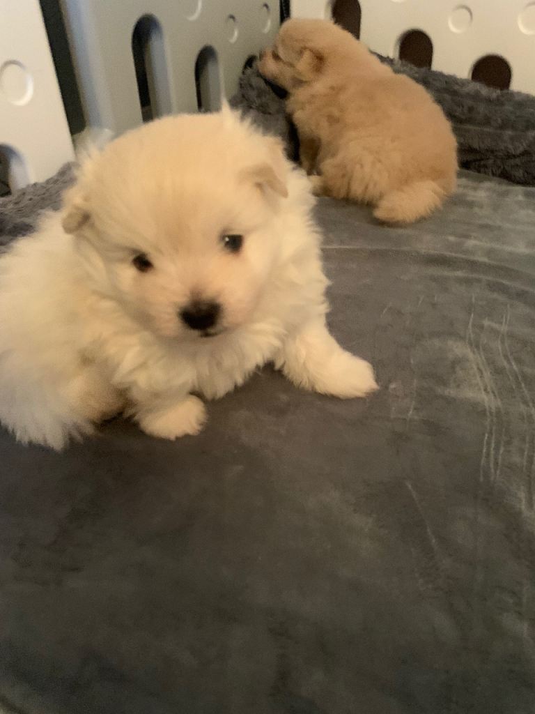 We have two adorable puppies left looking for there forever homes mum is a terrier cross Pomeranian and dad is a full Pomeranian both are our pets so can be seen. Pups will come with 1st vaccination, microchip up to date with worm and flea and a puppy pack and advice and support from us anytime. Pups are 4 weeks old looking for loving forever homes only. We have one white boy (very fluffy already) and one cream girl. Both mum and dad are a small breed and both weigh just under 3kg we are located in Derbyshire.